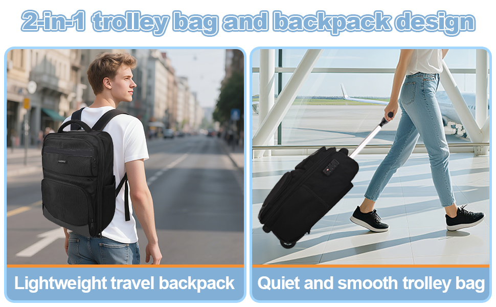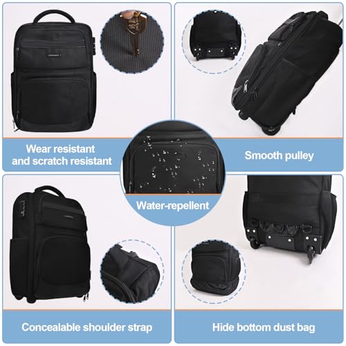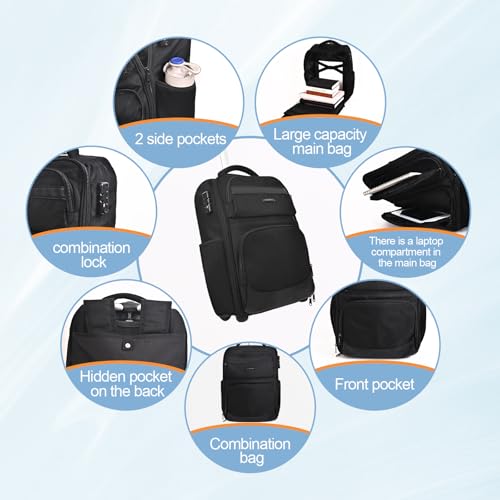 - Durable materials: This rolling backpack carryon luggage is made of durable, scratch resistant, and waterproof Oxford cloth fabric, equipped with a sturdy zipper and password lock. The wear-resistant and dustproof pad design, as well as the breathable and hidden shoulder straps, enhance the comfort and durability of this luggage compartment