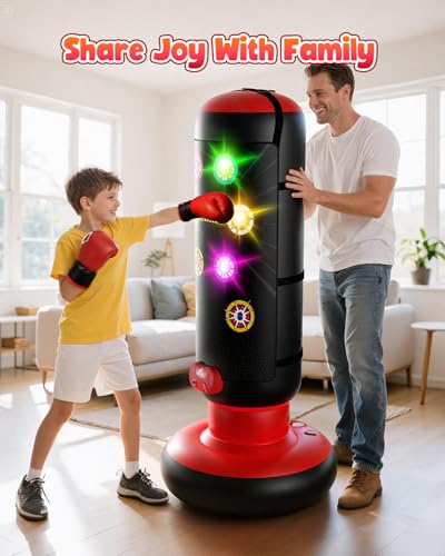 Hot Bee Interactive Punching Bag for Kids, Boxing Bag with Music & Light 4-Mode Game, Inflatable Punch Bag with Gloves, Kids Gym Equipment, Boxing Gifts Toys for 6 7 8 9 10 11 12 Year Old Boys