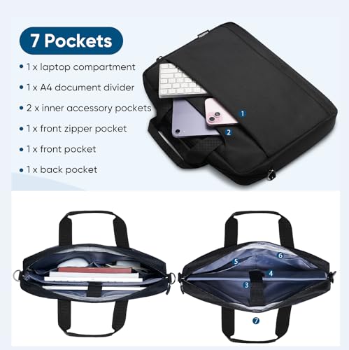 - [Enough Storage Space]: equiped with 7 pockets (1x padded laptop compartment, 1x document compartment, 2x inner small pockets, 1x front pocket, 1x front zipped pocket and 1x back pocket), the 15 15.6 Inch laptop case sleeve offers lager enough storage space for laptop, ipad, tablet, mouse, charger adapter, smartphone, cables, pens, cards, documents and other items.