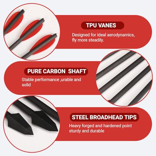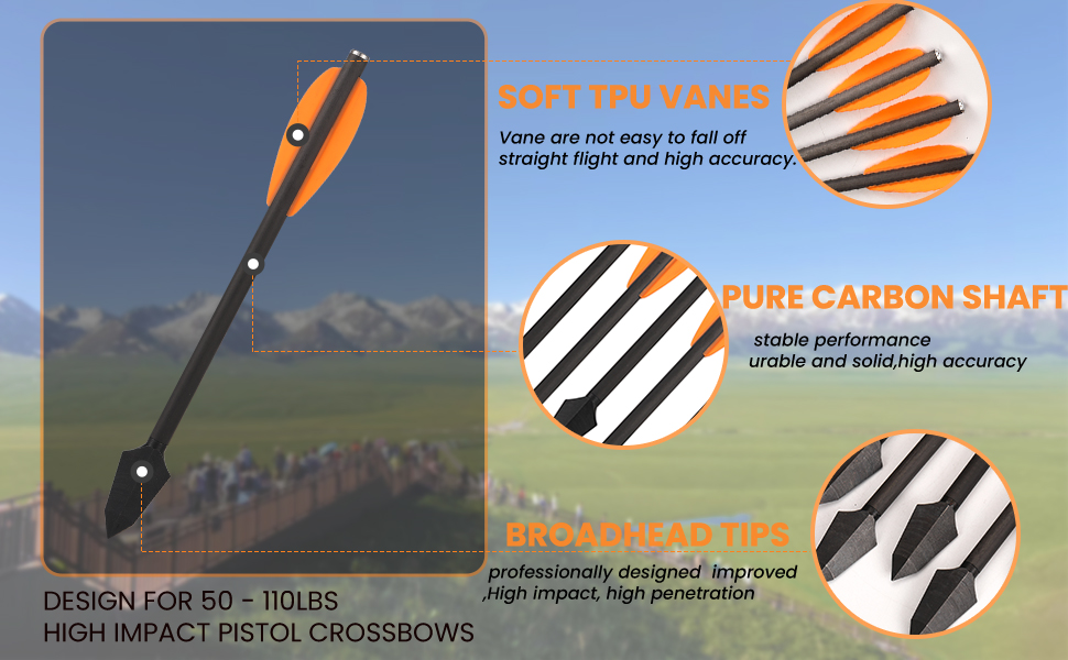 【Design Highlights】The Pistol Crossbow Arrow is Consists of pure carbon shaft and steel broadhead tip; Flat Nock made of aluminum, it very wear resistant; 2pcs tpu vanes; well made, stable performance ,urable and solid,good speed,high accuracy .
