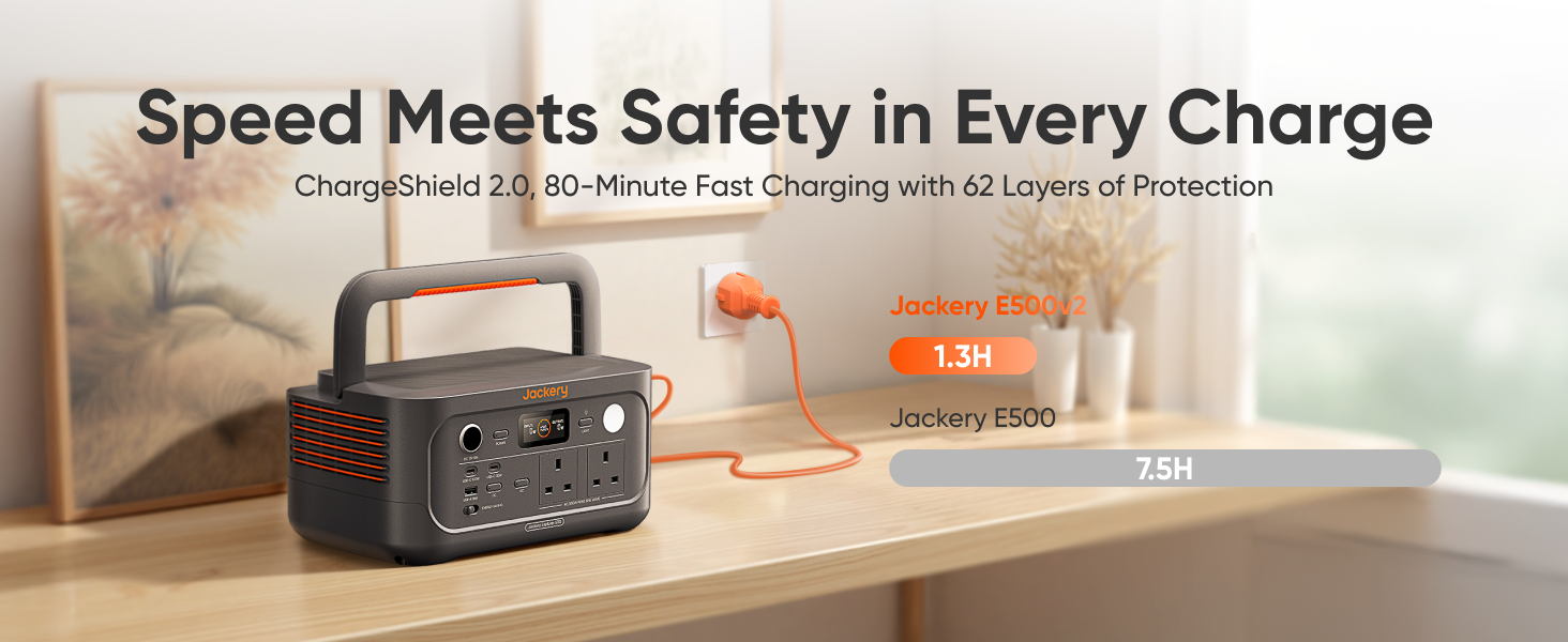 - Absolute Safety & Reliability. The Jackery Explorer 500 v2 camping generator delivers dependable power with CE, WEEE, and RoHS certifications. Its shock-resistant, fire-protected design ensures stable performance in tough environments, while the 10ms UPS restores power instantly to protect your desktop and data during sudden outages.