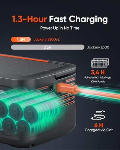 - High Performance:The Jackery Explorer 500 v2 packs 512Wh of reliable power into just 5.7kg, making this power generator ultra-portable for home, travel, or outdoors. Its 1000W AC output effortlessly powers everyday devices like fridges, kettles, and coffee makers, backed by a durable LiFePO4 battery with a 10-year lifespan and 6,000 cycles.