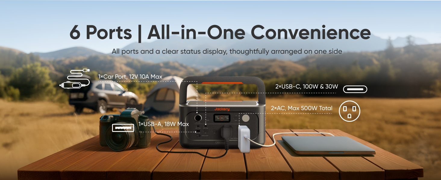 - 5 Charging Ports. The Jackery Explorer 500 v2, a compact 1000W power station, offers 100W PD fast USB-C charging (in & out), allowing direct device charging without the need for extra power bricks. With multiple ports, this solar generator powers several devices simultaneously, while its Bright and SOS lighting modes offer added convenience and safety.