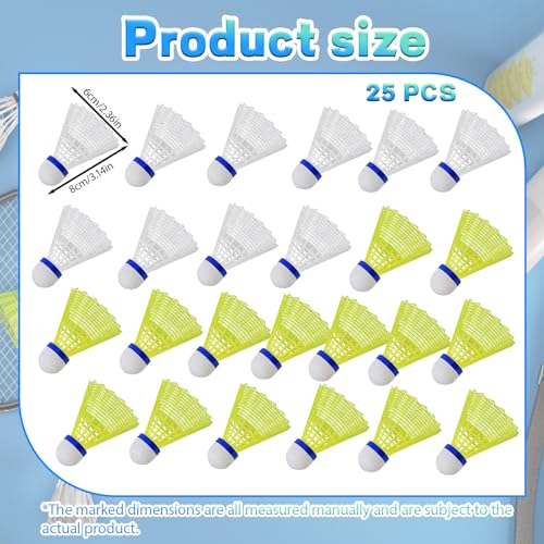 - Convenient Packaging: Includes 25 shuttlecocks with a mix of yellow and white colors for easy visibility; The compact size of 8*6 cm ensures easy storage and portability for on-the-go play.