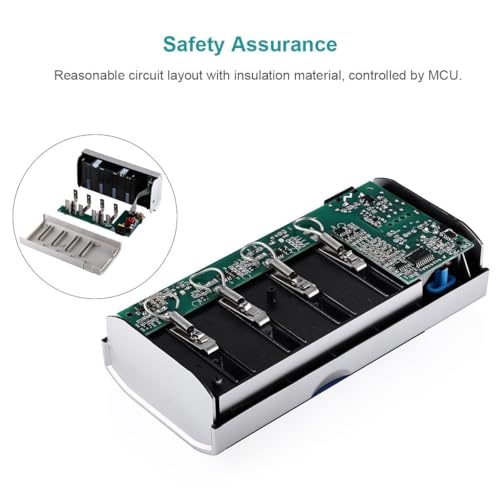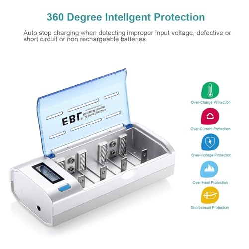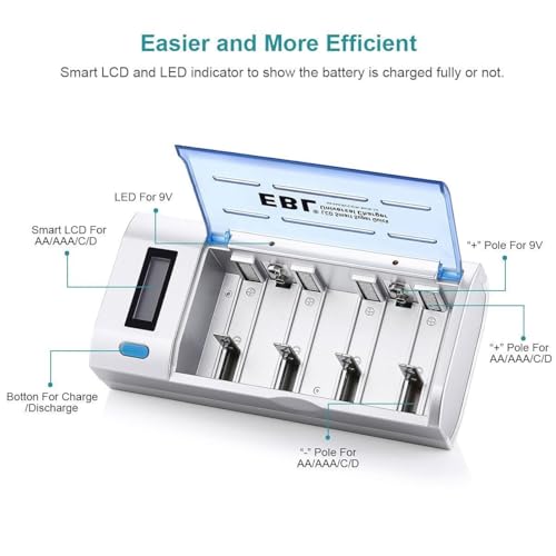 - An LCD screen displays the status (charging, discharging, full, or bad) for AA/AAA/C/D batteries, while a dedicated blue LED indicator is reserved for monitoring the 9V battery's discharge function.