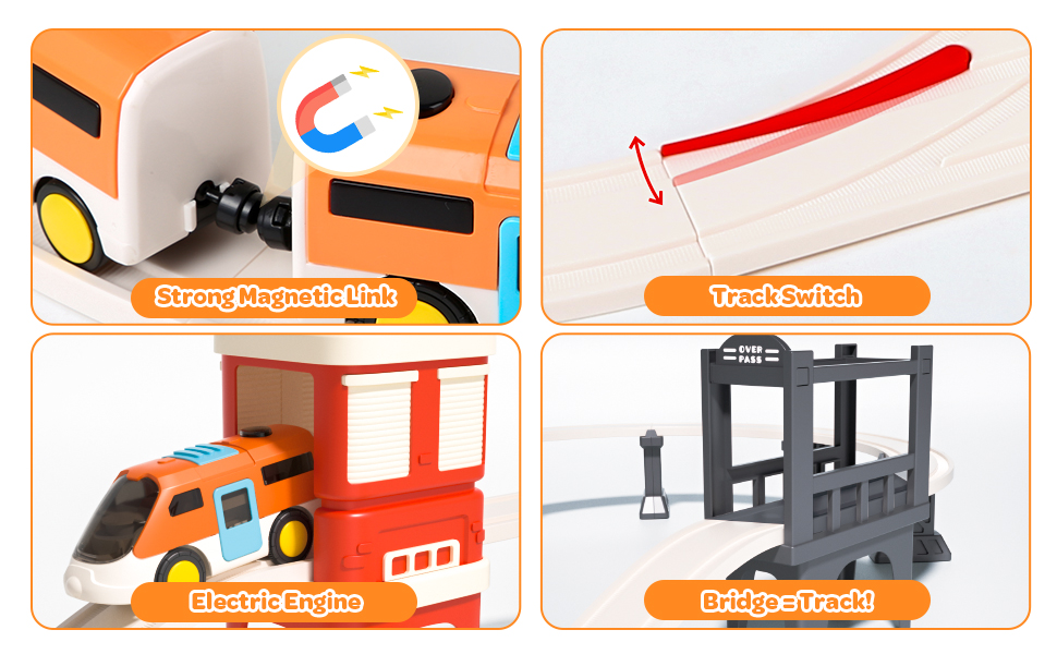 Magnetic Train Tracks Toy: Press the button to start the engine with a bright red light. Cars connect with strong magnetic couplings—no hooks required, easy for little hands to build and redesign.