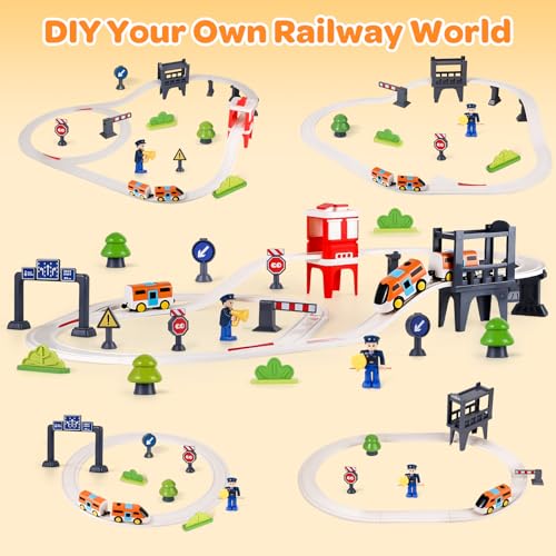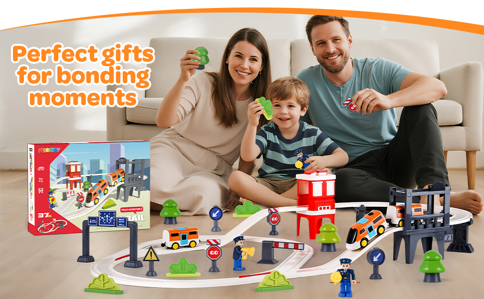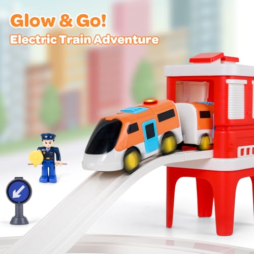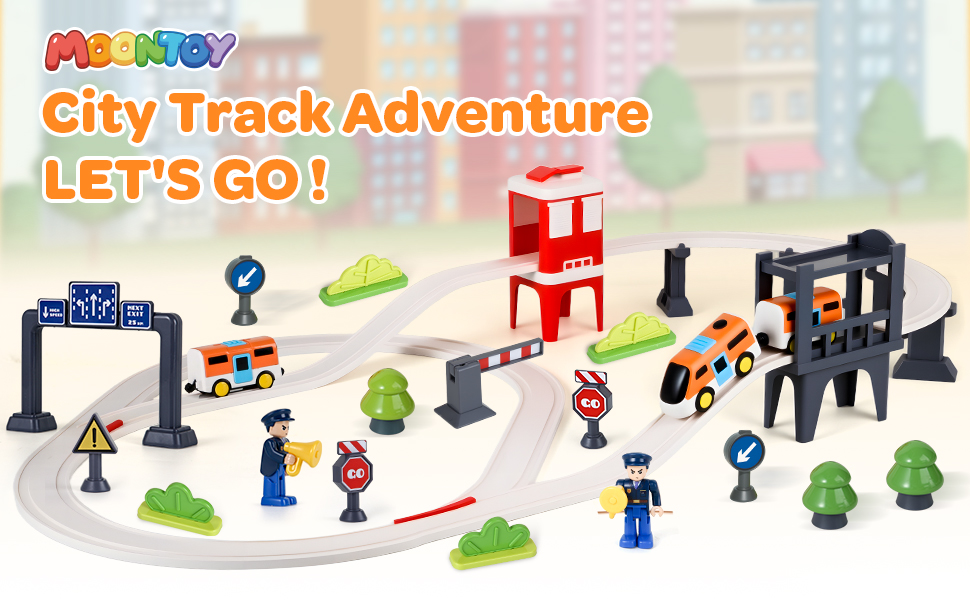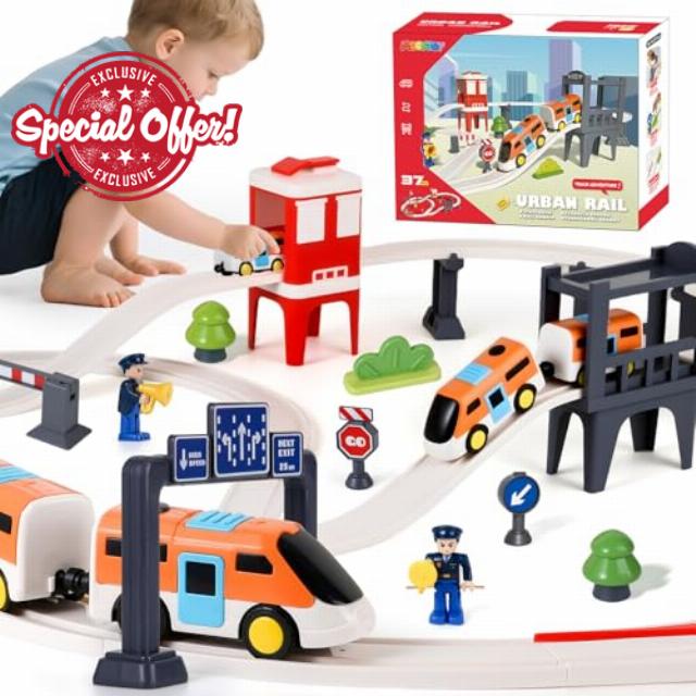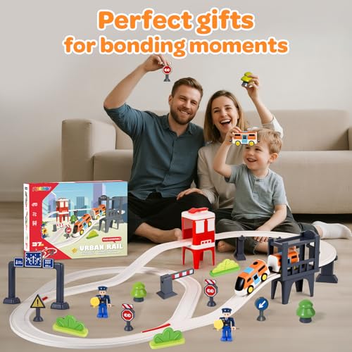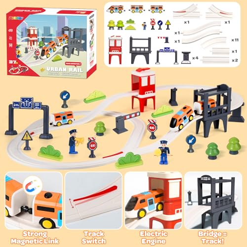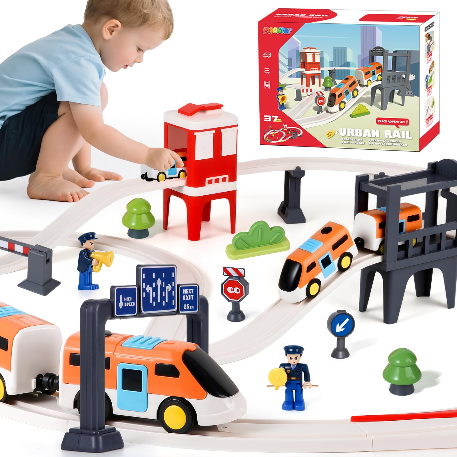 MOONTOY Train Set for Kids, 37 Pcs Electric Train Toy with 3 Cars(Magnetic Connection), Bridge, Urban Elements, DIY Train Tracks Toy for 3 4 5 6 Years Old Boys Girls, Christmas Birthday Gifts
