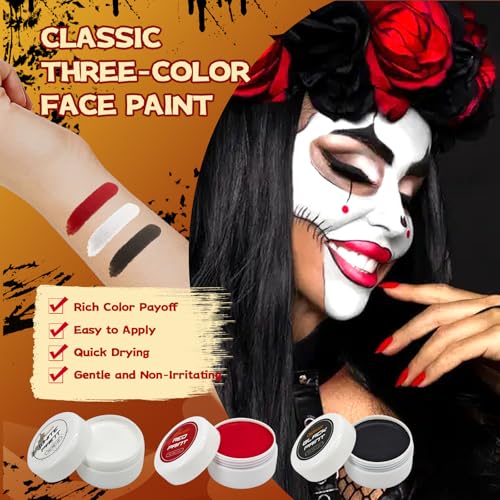 Pigmented & Full Coverage: This three colors face body paints uses high-quality pigments to deliver high color payoff with every application, providing vibrant colors and full coverage. Creating a wide range of looks from subtle to bold and dramatic, including zombie makeup, clown makeup, skull makeup, Day of the Dead makeup, vampire makeup, ghost makeup, demon makeup, gothic makeup and more