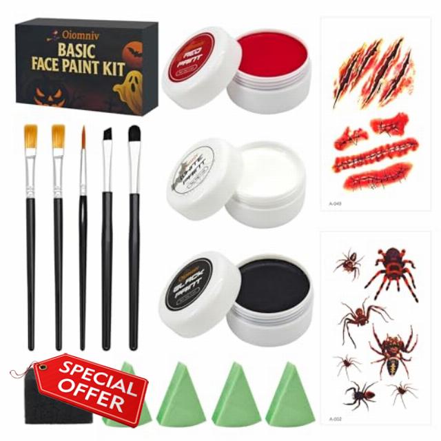 White Black Red Face Body Paint: Oiomniv face paint kit contains 3 colors professional face paints with 5 pcs painting brushes, 4pcs sponge and 2 stickers. Each face paint weighs 30g/1.02oz, suitable for use on the face and body, enough to cover the entire body from head to toe
