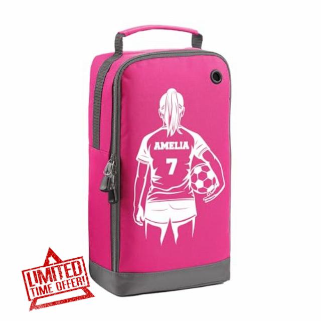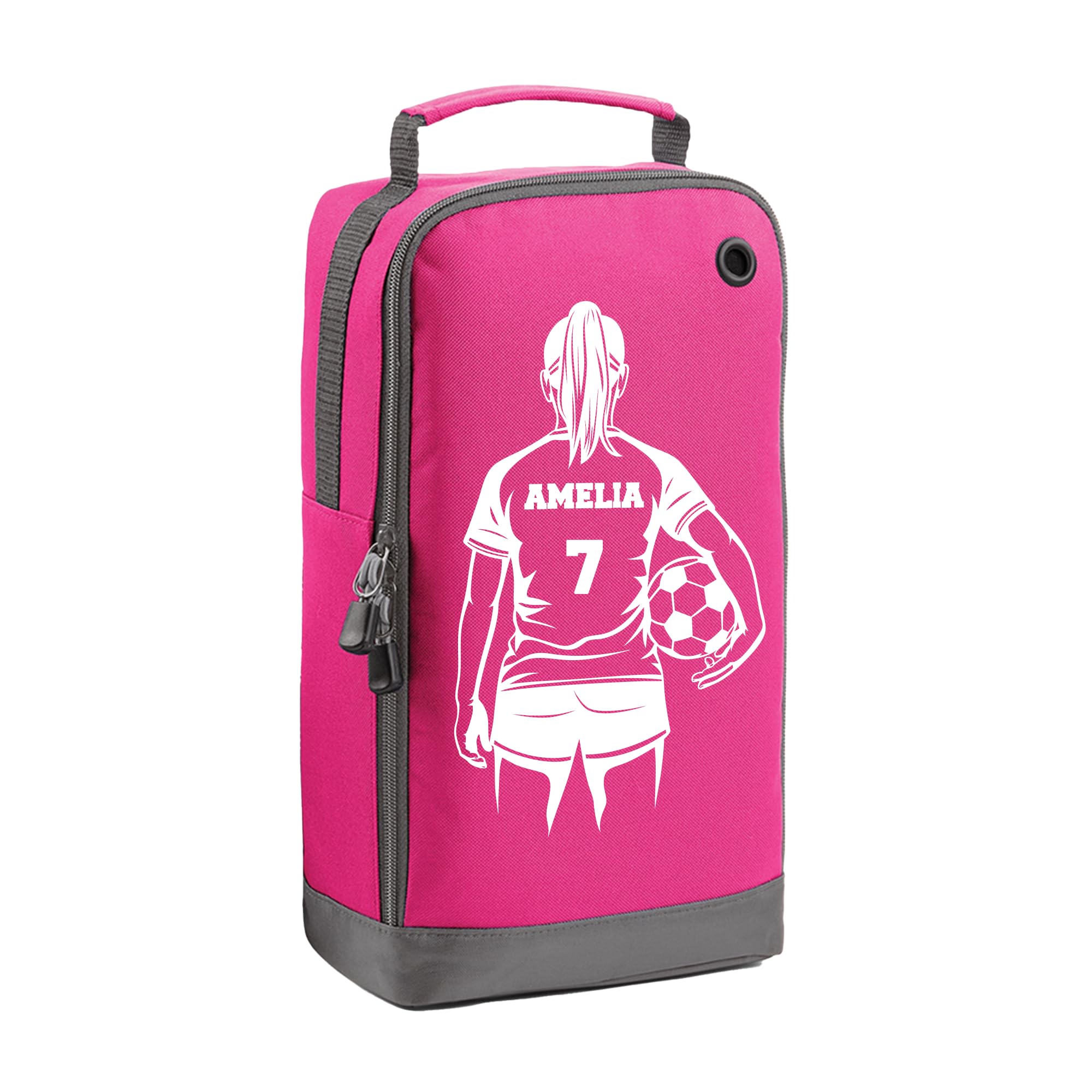 Personalised Kids Boot Bag – Custom Name Sports Shoe Bag for Football, Rugby, Cricket, PE & School – Gift for Boys & Girls (Girl Shirt + Number, Pink)