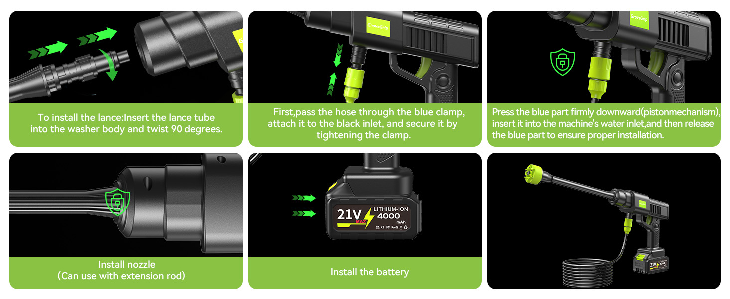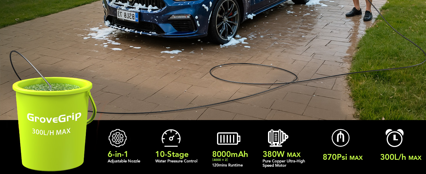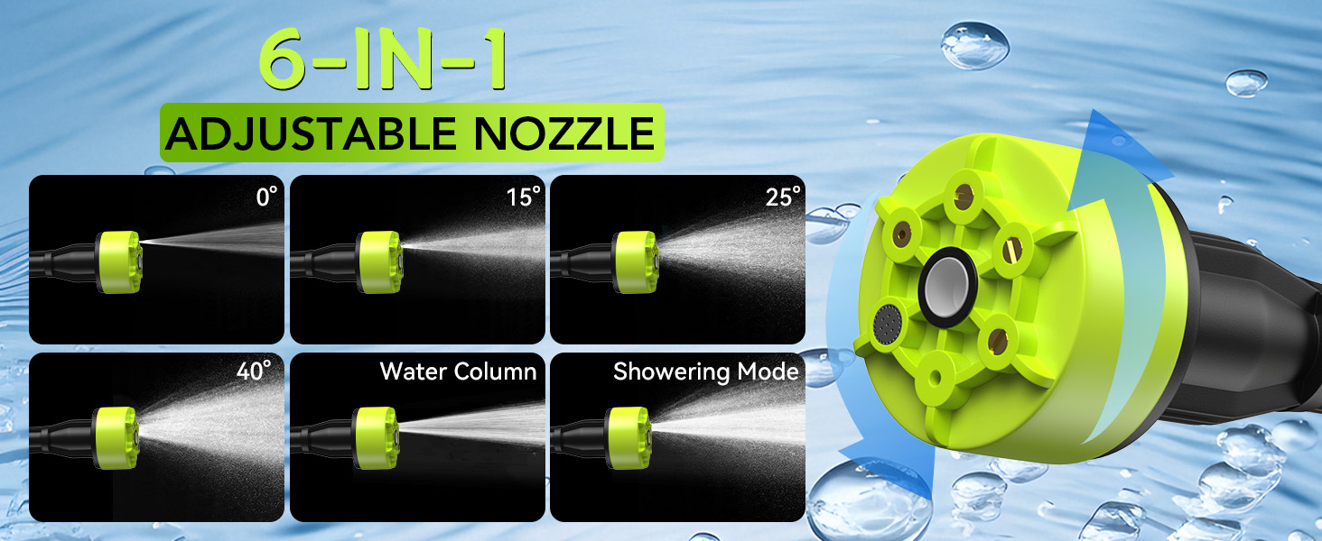 6-in-1 Nozzle & High-Power Jet: Features 6 interchangeable nozzles and a pure copper ultra-high-speed motor, delivering crushing power up to 60 bar (870 PSI) and a 300L/h max flow rate. Effortlessly blast away stubborn dirt, grime, moss, and grease.