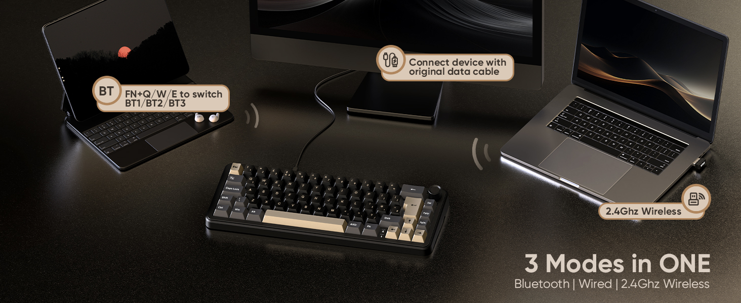 - 【3-Mode Connection & 4000mAH Battery】Get rid of messy cables! The K65 supports 2.4G wireless for high-speed response, Bluetooth 5.1 for easy pairing with multiple devices, and USB-C wired connectivity with plug-and-play. Seamlessly switch between PC gaming, tablet creation, and mobile communication to build an ultra-clean, organized gaming and workspace.with a built-in 4000mAh high-capacity battery, it delivers up to 120+ hours of runtime with backlight off,whether you’re in marathon creative sessions, juggling multiple tasks, or deep in intense gaming battles, your focus stays fully charged.