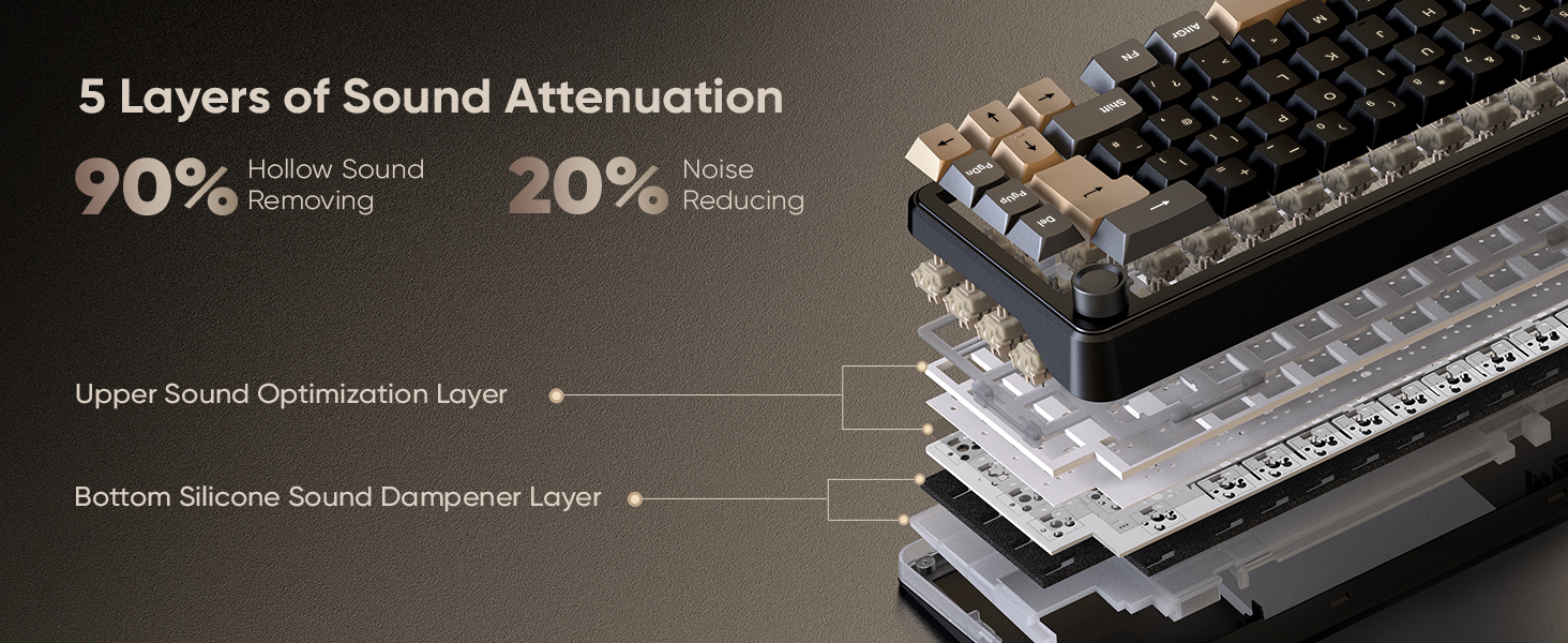 - 【Gasket-Mounted Five-layer Noise Reduction】When you press a keycap, the force is transmitted through the switch to the bottom silicone pad, then disperses across the IXPE switch pad, Poron silencing cotton, PET sound enhancement pad, and PCB single-key grooves before reaching the soft cushioning layers. These layers undergo slight deformation upon impact, absorbing a portion of the force. This design significantly reduces keypress noise and vibration, with every keystroke akin to stepping on a cloud, ensuring the purest acoustics and a smooth, soft typing experience.