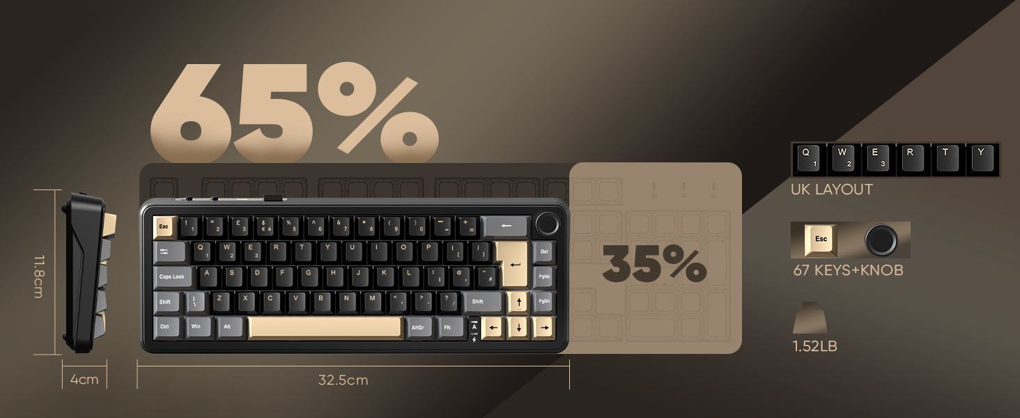 RedThunder K65 60% Wireless Mechanical Gaming Keyboard,Creamy Gasekt-Mounted,Volume Knob,Ultra Compact UK Layout 67 Keys,2.4G/BT/USB-C,RGB Underglow Lighting,Hot swappable Fast Apricot Switch