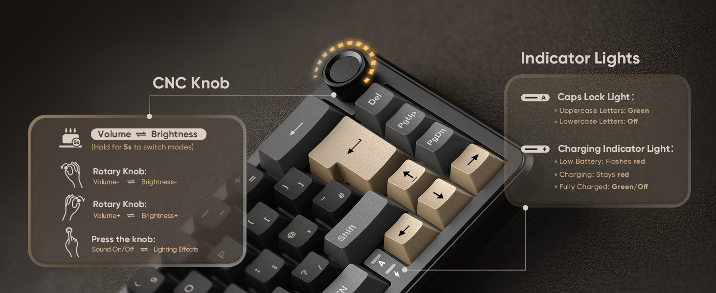 The knob has two functions. If rotating it doesn't adjust the volume, long-press the “knob” until the “battery indicator” and “Caps Lock” LED flash three times, indicating a successful mode switch. You can then adjust the volume.