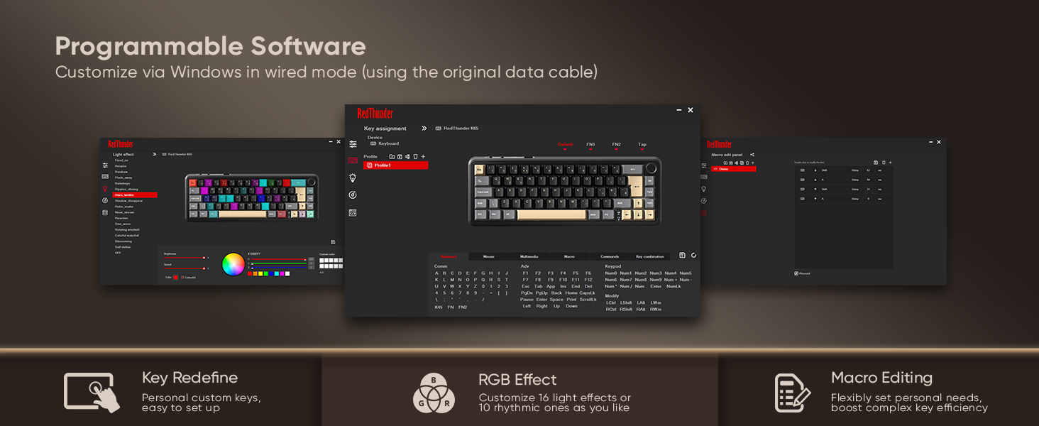 - 【RGB Backlight Keyboard & Software Support】The K65 RGB keyboard supports 16 preset backlight modes that can be freely selected using the knob. Multiple dynamic RGB effects, monochrome and Colorful Mode. The south-facing lamp position makes the overall effect more uniform and soft.The RGB mode and color can be customized through software, and all keys support macro customization, allowing macro recording and editing, creating a personalized game atmosphere.(Note:The RGB backlight does not come thru the keys.Driver supports Windows only)