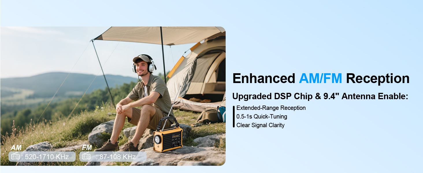 This FM radio has a high-sensitivity receiver chip and a 57mm full-range speaker, ensuring clear, interference-free reception in any environment. The speaker delivers deep bass and clear treble for an immersive sound experience