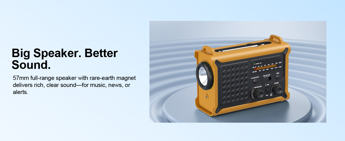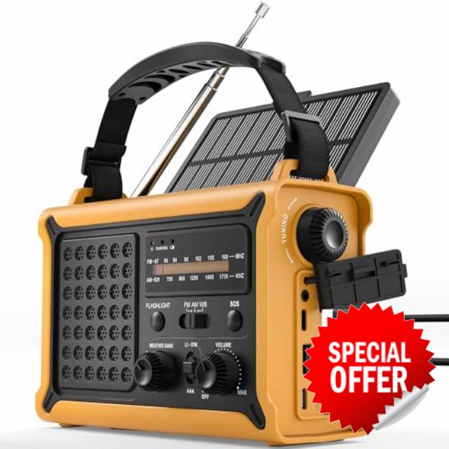 It's the perfect blend of "old-school" and "new-tech" – with rotary dial tuning and multiple power options: solar, hand-crank, USB-C charging, and AAA batteries (not included), ensuring you're always prepared for any emergency