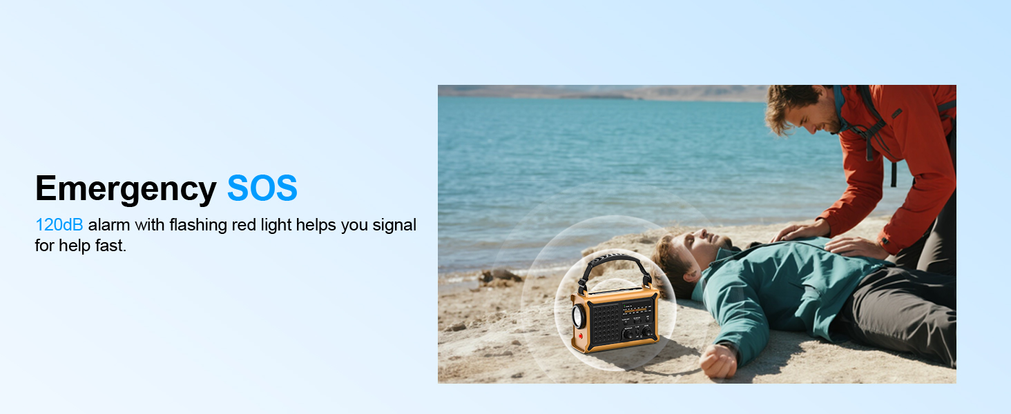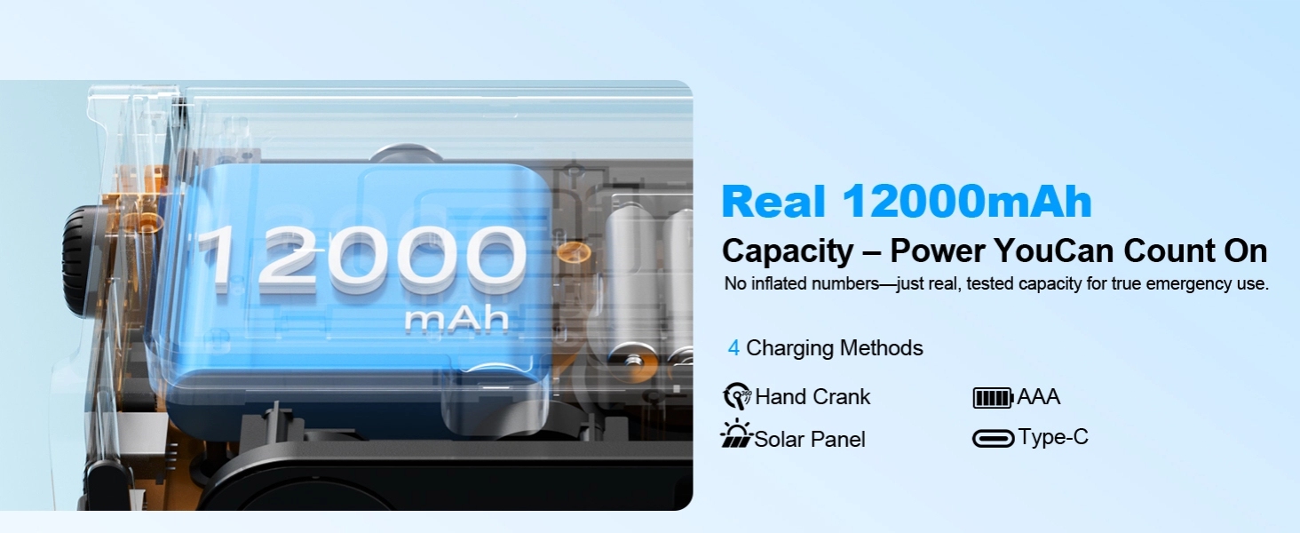 Built for emergencies, the 12,000mAh battery powers your phone, light, or radio for hours. It also features a loud 120dB SOS alarm and flashing light, ensuring you're seen and heard in critical situations