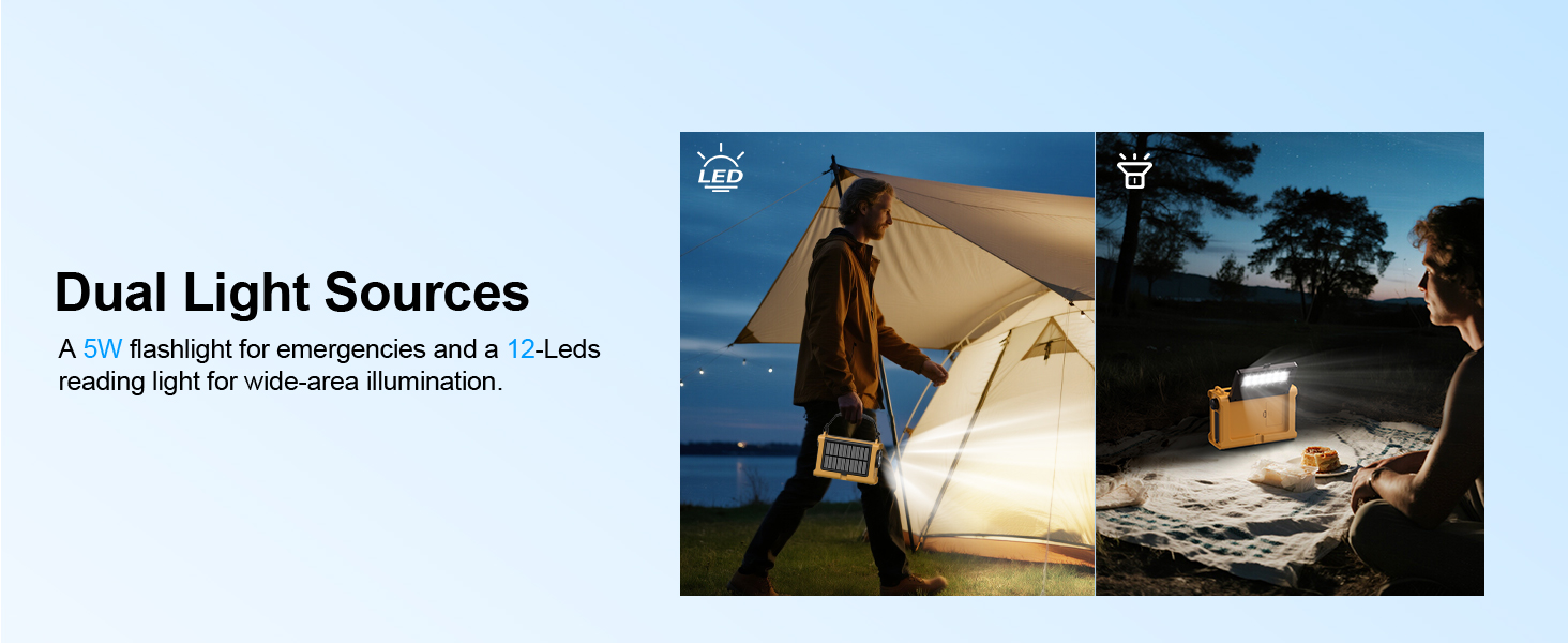 The reading light and flashlight have independent switches. The 5W high-brightness flashlight is designed for power outages or outdoor lighting, while the soft LED reading light provides a comfortable light source for reading