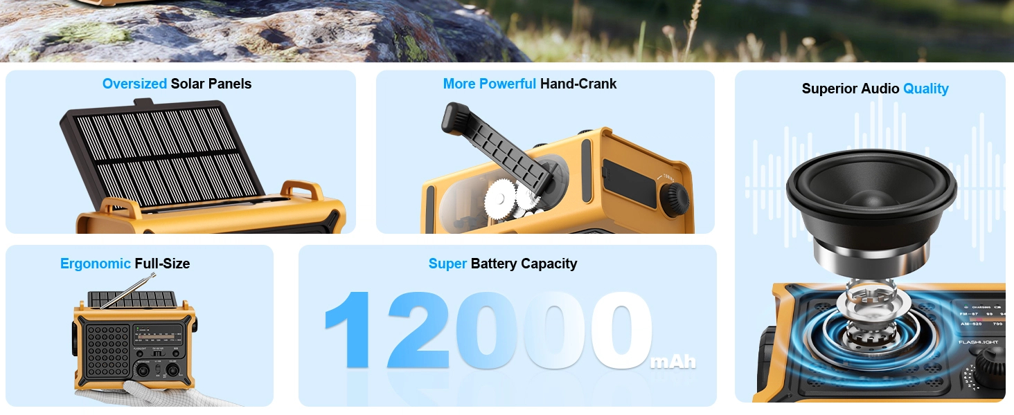 ROCAM FM/AM Wind up Radio Solar, Emergency Survival Radio with 12000mAh Rechargeable Battery, Torch, Reading Light, Type C & USB Charging & SOS for Power Outages & Outdoor Camping