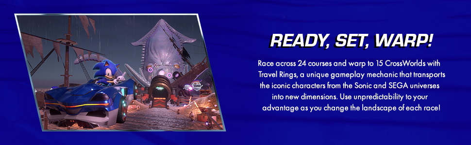 Race across 24 tracks and warp to 15 CrossWorlds with Travel Rings, a unique gameplay mechanic that transports the iconic characters from the Sonic and SEGA universes into new dimensions. Use unpredictability to your advantage as you change the landscape of each race!