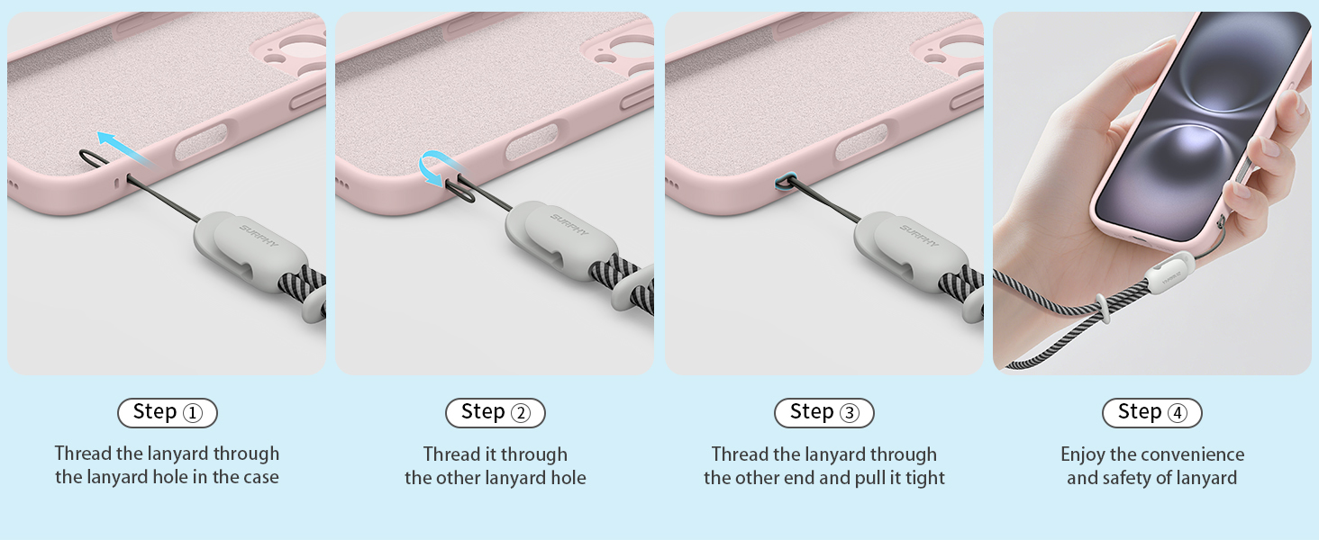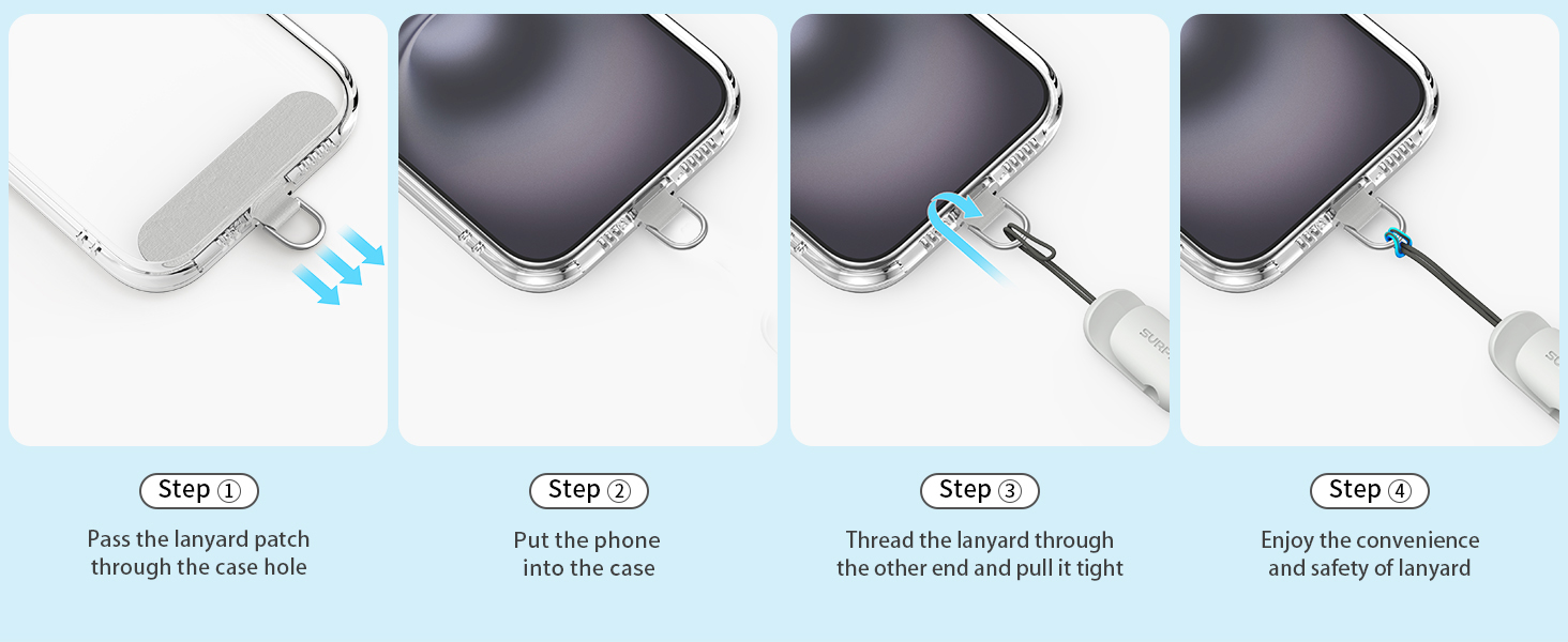 - Two Installation Modes: One, pass through the port or hole on the phone case with the thin rope of lanyard; Two, put the TAB through the charging hole of the phone case, connect the thin rope part of the strap lanyard to the metal ring on the tab