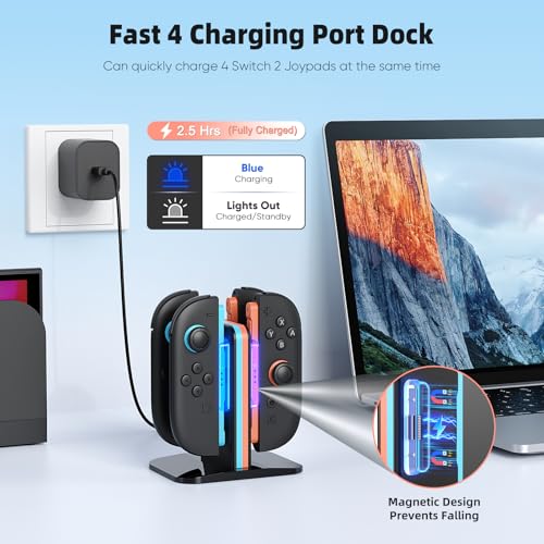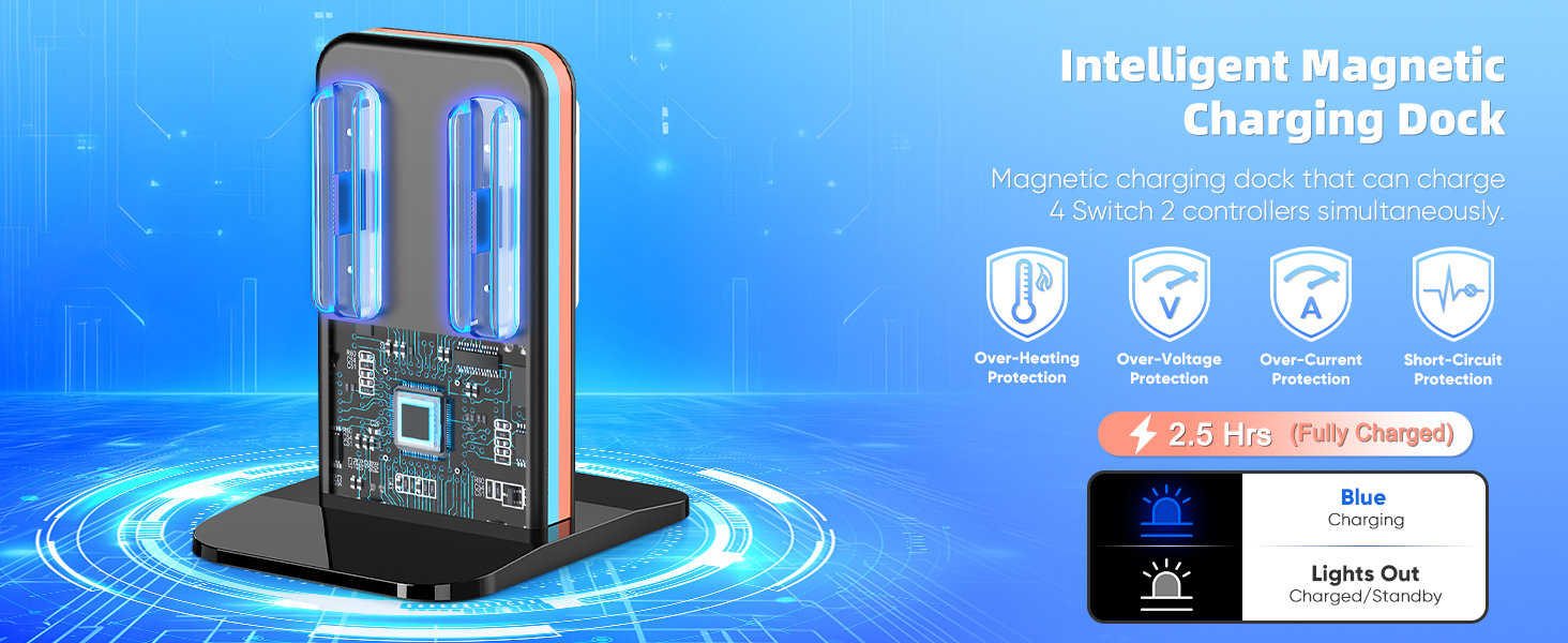 Safe Charging Dock for 4 Joy con — Magnetic ports enable charging after connect controller, blue light on during charging, lights out when charged/standby. The charging stand offers safe and easy charging for switch 2 controller with its safety features like overcharging, overcurrent, overheating, and short-circuiting protection. It can be used with protective cover like our PC cover, eliminating the need to remove the protective cover during charging.