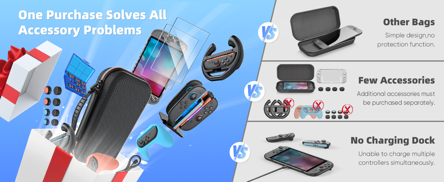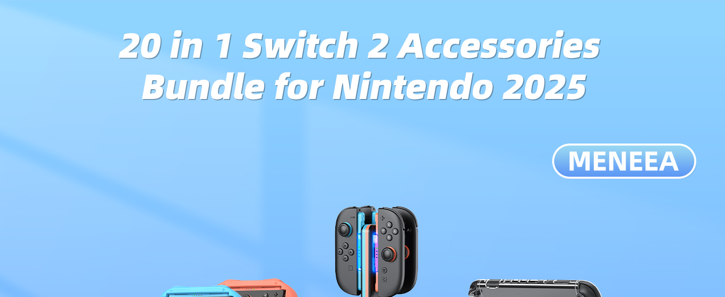 20-in-1 Accessories Kit for Switch 2 — MENEEA Super Bundle for Nintendo Switch 2(2025) includes: Storage case*1, Protective cover for Console*1, Protective case for Joypad*2, Charger dock stand*1, Grips for Joy Controller *2, Steering Wheels for Mario Kart *2, Tempered films *2, Thumb grips *8, Game Card Case *1. One purchase solves all accessory problems. It's simply the top picks for Nintendo Switch 2 Owner!