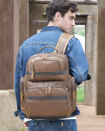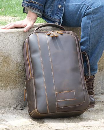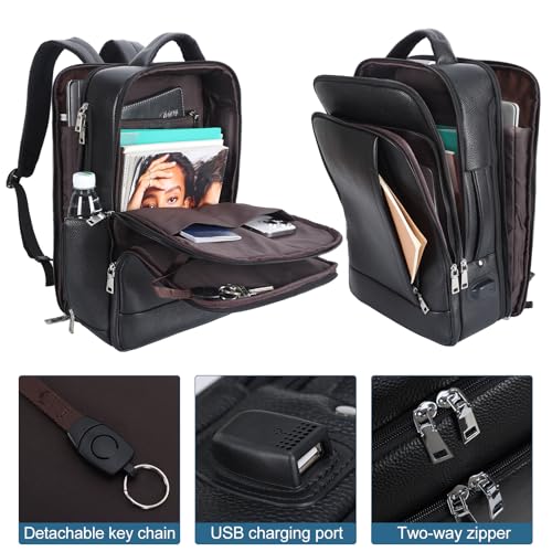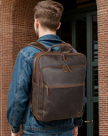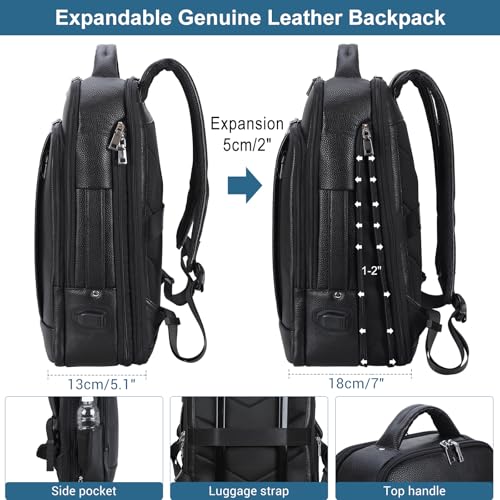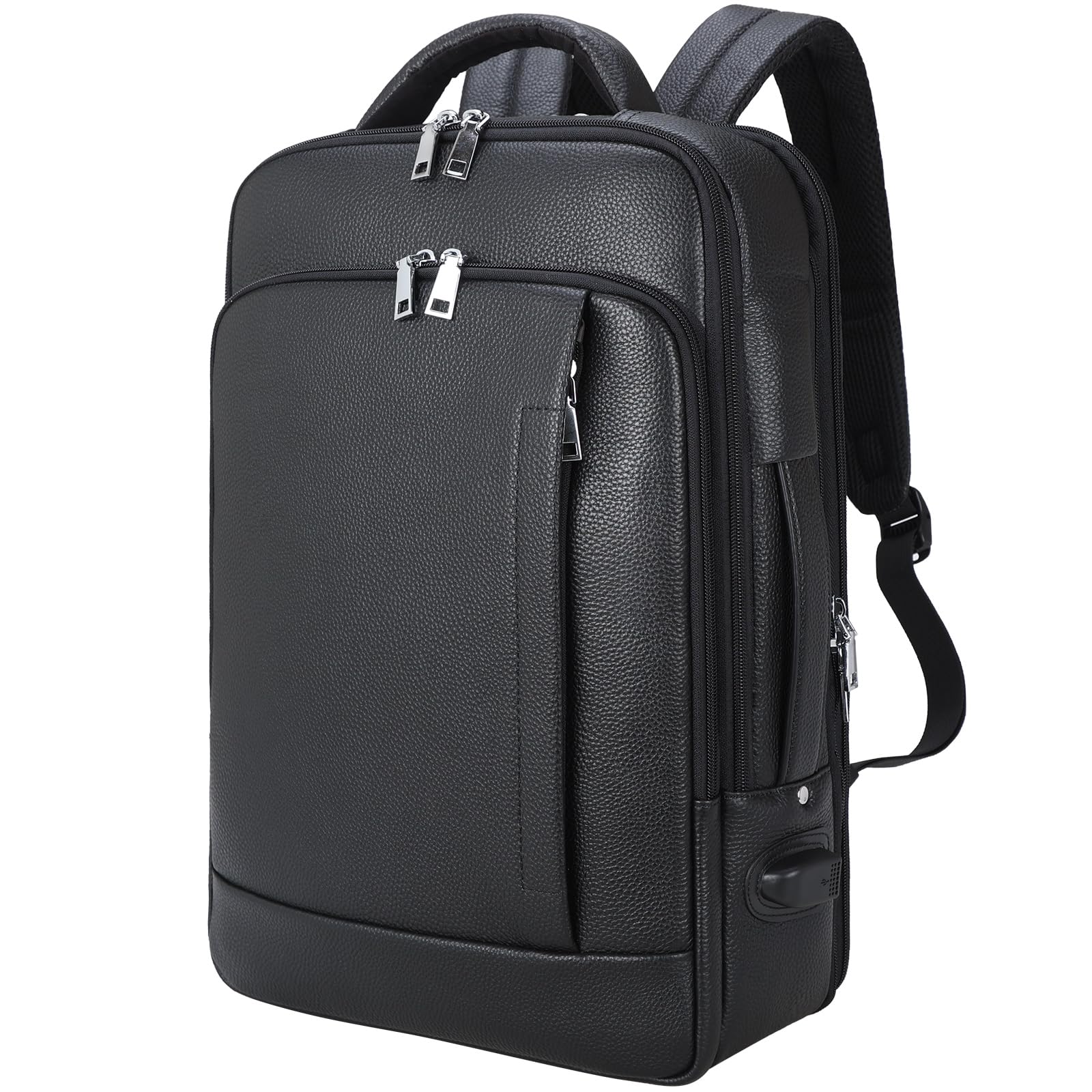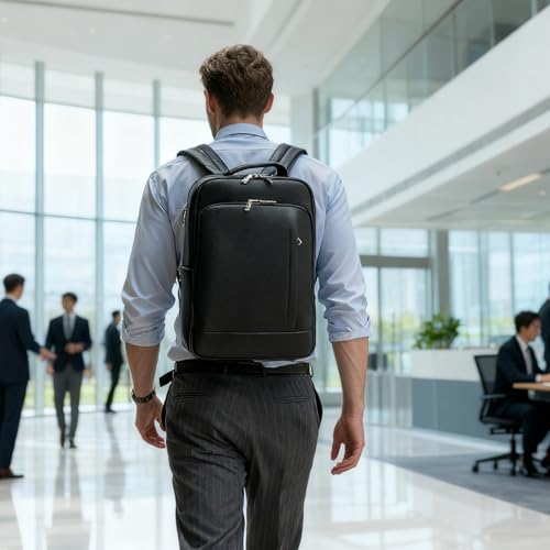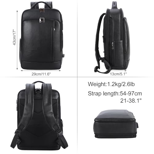 【Full Grain Cowhide Leather】The black slim backpack is made of 1.6mm thick full grain leather, which has a tight texture and remarkable durability. The leather finish is smart and grainy, not shiny, making it resistant to marks and scratches. (Note: It has a natural leather smell that will disappear after a few days in a dry, ventilated place)