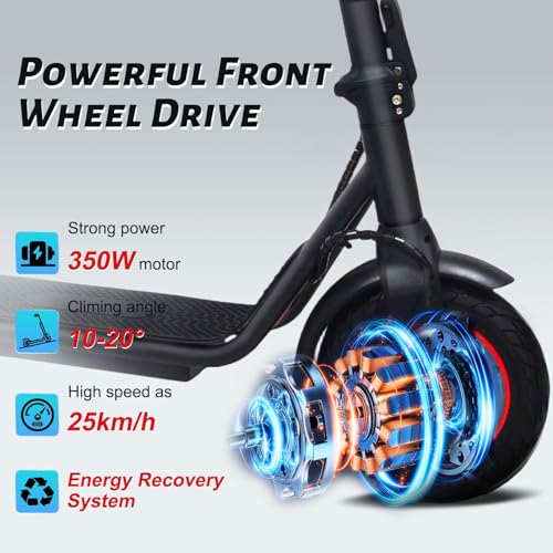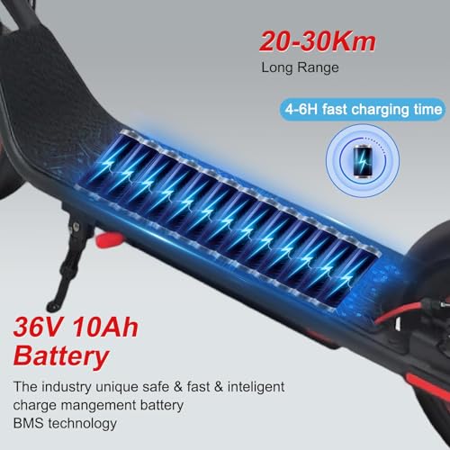 - Powerful Motor & Long-Range Battery:The TYOKUM electric scooter features a strong 350W brushless motor paired with a high-capacity 36V 10Ah battery, offering a top speed of 25 km/h and up to 20-30 km of range on a single charge. Equipped with an advanced BMS featuring short-circuit protection, over-current protection, over-charge protection, over-discharge protection, and abnormal temperature protection. with fast charging in 5–6 hours.
