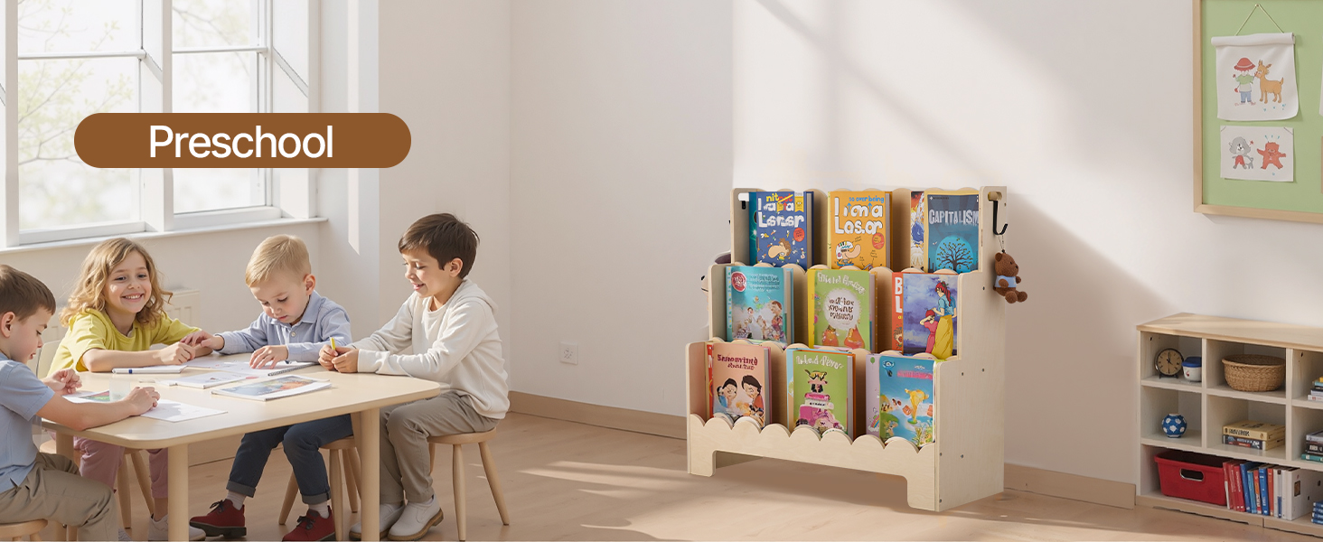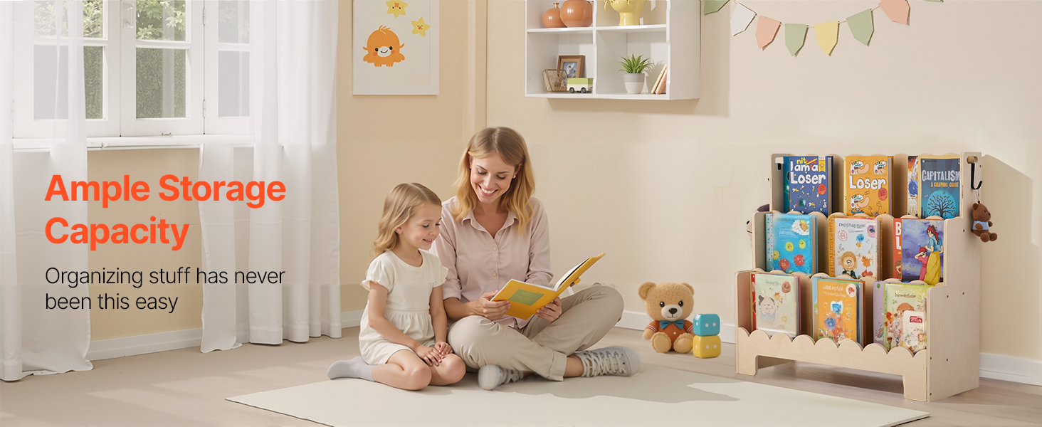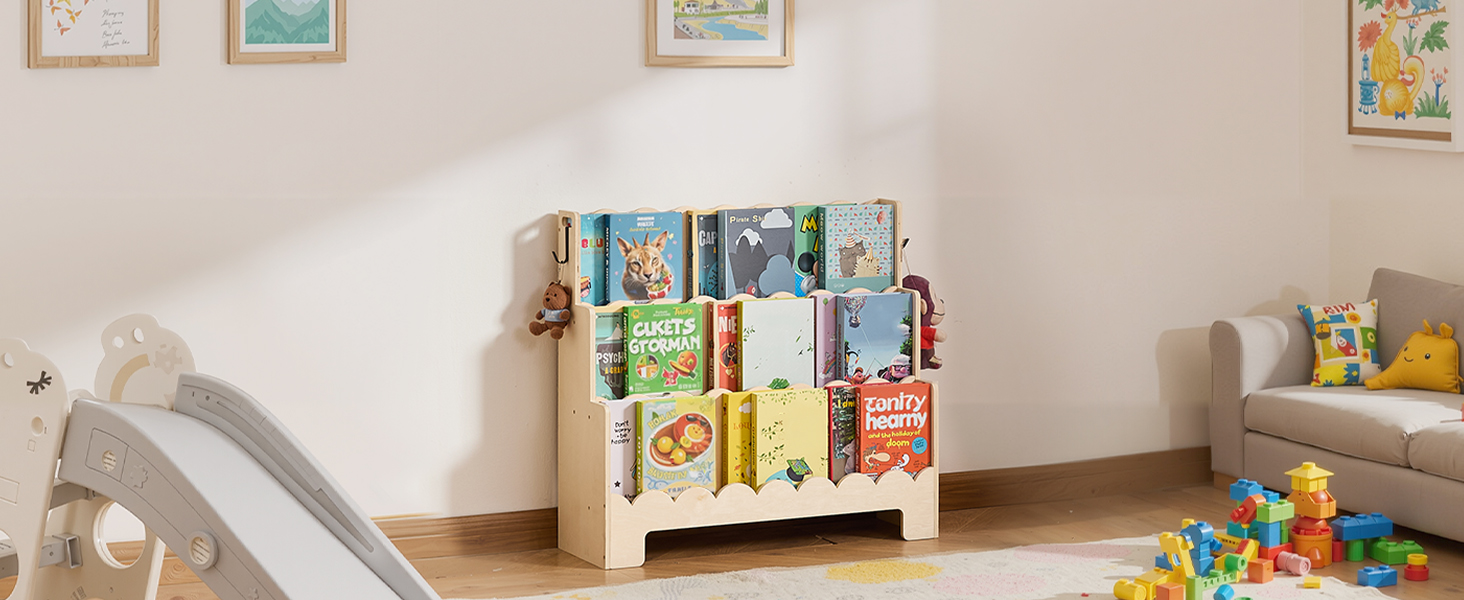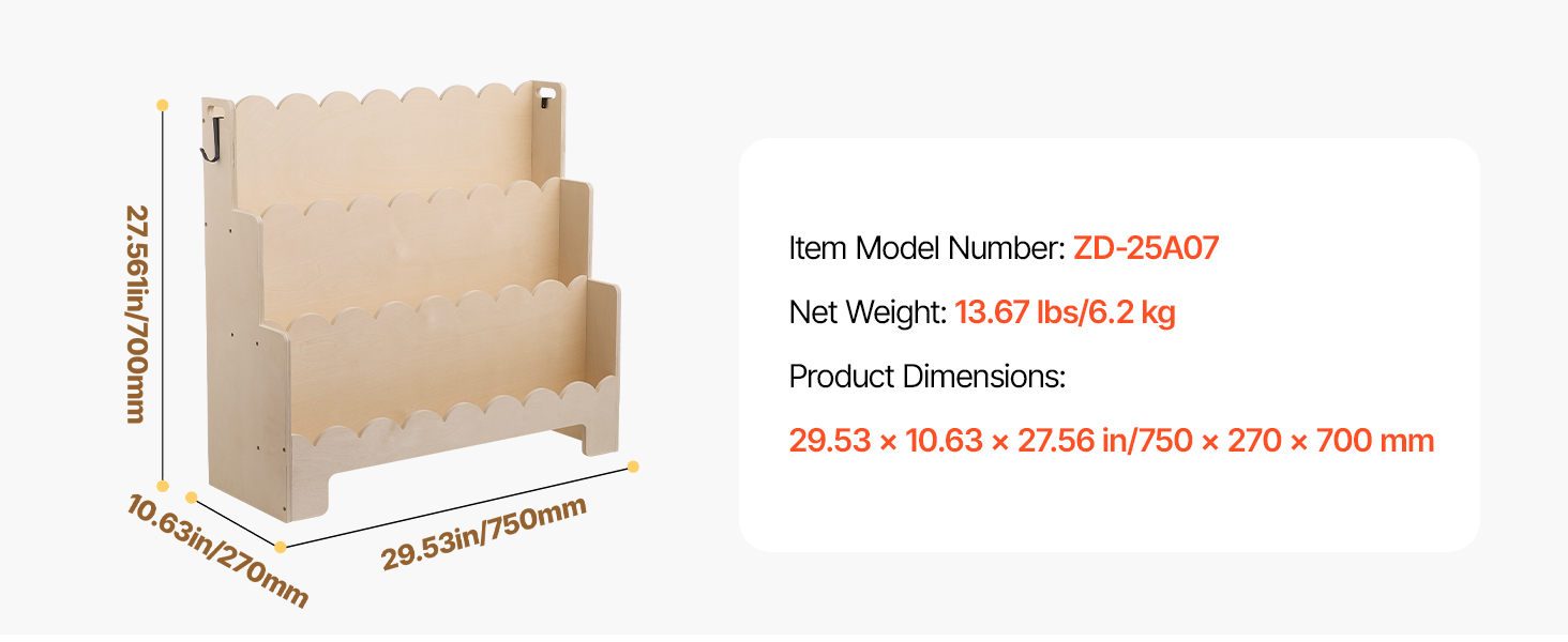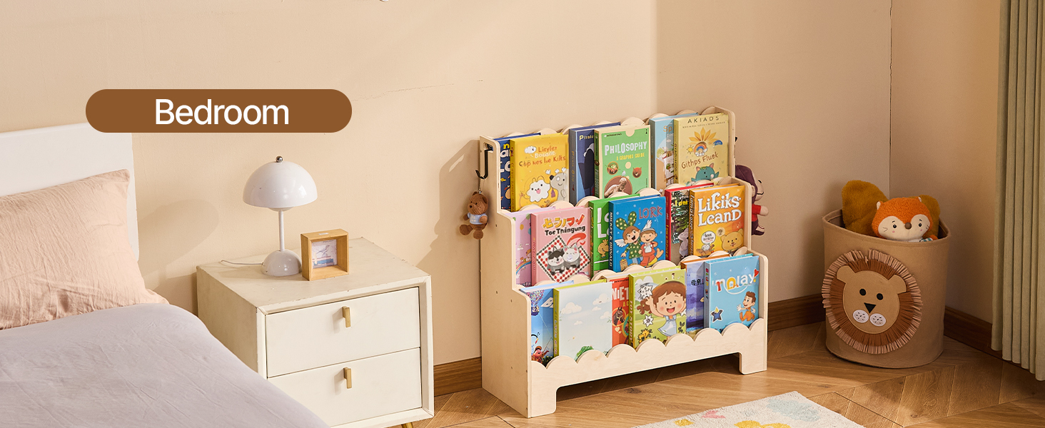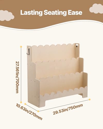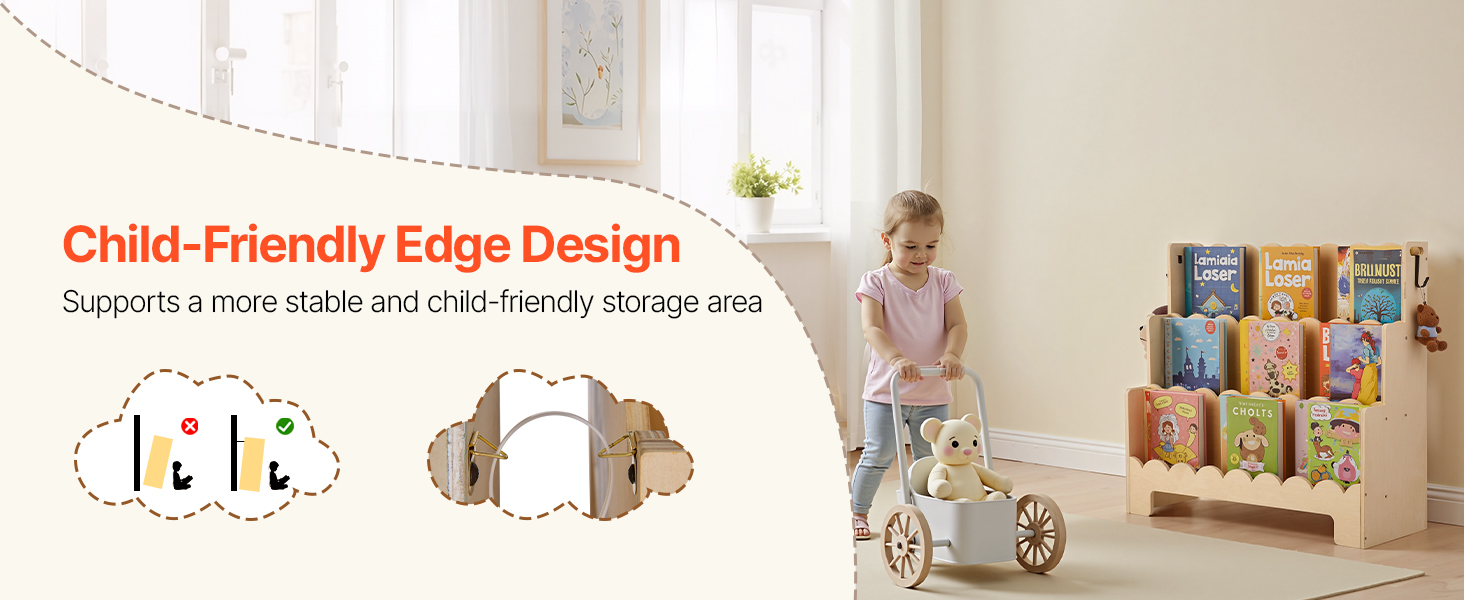 Streamlined Organization: This scalloped book shelf features 3 compartments and side hooks for hanging bags or cloths. Curved edges and open design keep books, toys, and supplies neatly arranged, helping kids find items easily and build tidy habits from an early age