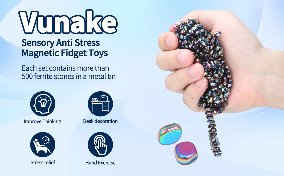 Discover endless fun and relaxation with the Vunake Magnetic Stones Set, featuring over 500 ferrite mini magnetic beads and 2 large smooth magnets, neatly packed in a sleek metal tin. These magnetic beads are designed for stress relief, creativity, and focus – making them the perfect desk toy for adults and teens