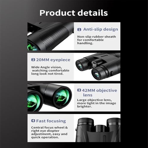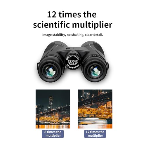 - 【12×42 High Magnification & HD】This binoculars for adults high power is equipped with 12x magnification and a 42mm large objective lens, paired with high-quality BAK4 prism and multi-layer coated (FMC) lens. It boosts light transmittance significantly, delivering sharp, clear imaging. Whether used as bird watching binoculars to capture fine feather textures of distant birds or as binoculars for stargazing to see star details during stargazing, it performs excellently, letting you explore the distant world easily.