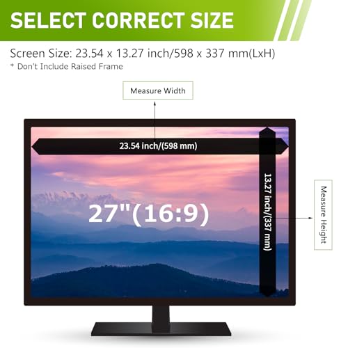 - Suitable 27 Inches Screen Size: Compatible for 27" Widescreen Monitor – Aspect Ratio 16:9. Dimension: 23.54 x 13.27 inch/598 x 337 mm(LxW). Please check or measure the screen size yourself before purchasing this privacy filter. (This product is not a computer monitor)