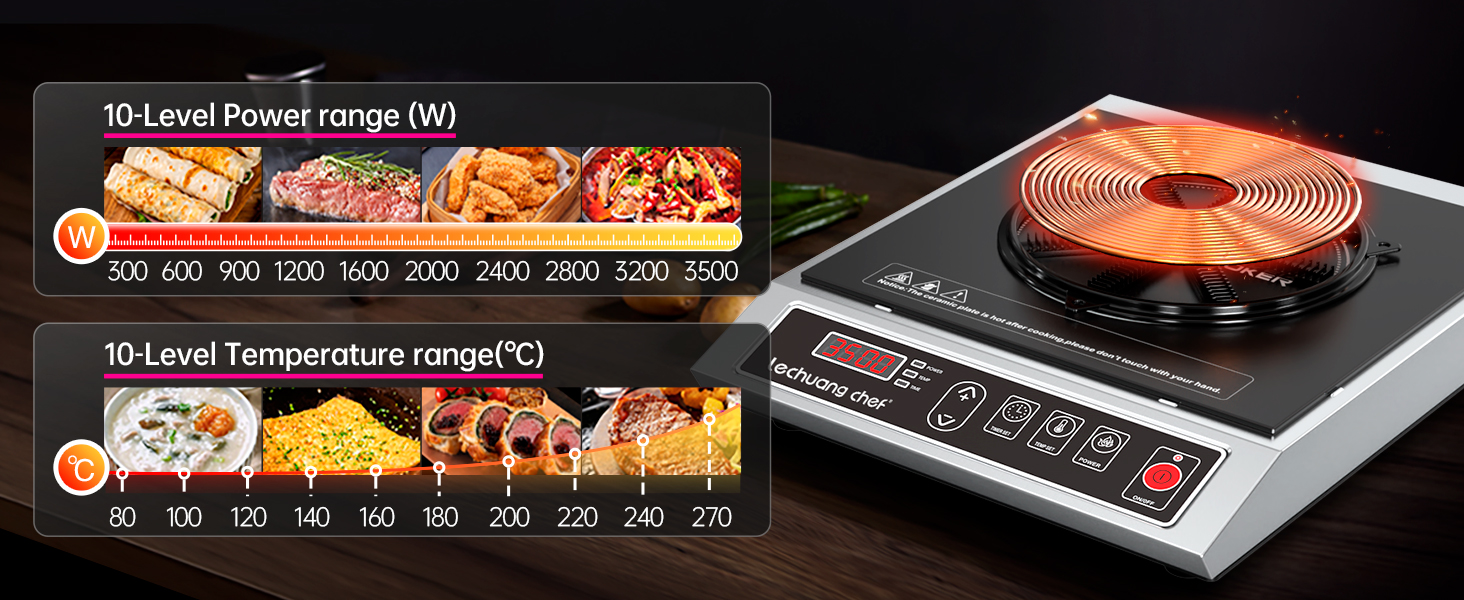 - 【Interchange between Temperature and Power Settings】With 24 hours timer,10 power settings between 2000W to 3500W,10 temperature settings from 60 ℃ to 240 ℃,Lechuang Chef single induction hob meets all your cooking needs.Not only could shorten the cooking time ,but also will help you with reserve more spare time for what you interest.