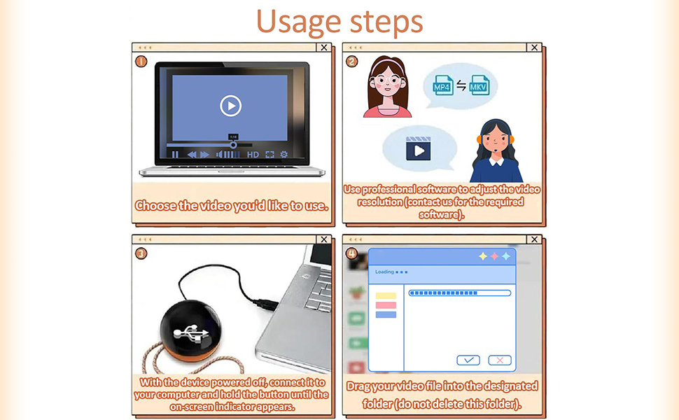 【EASY SETUP & USER-FRIENDLY CONTROL】Connect to your computer via USB to easily save videos and photos to your video ball. Only two formats are supported: MP4 for videos and JPG for images. Easily switch between videos and photos, and adjust the volume with a button, giving you full control over your video ball.