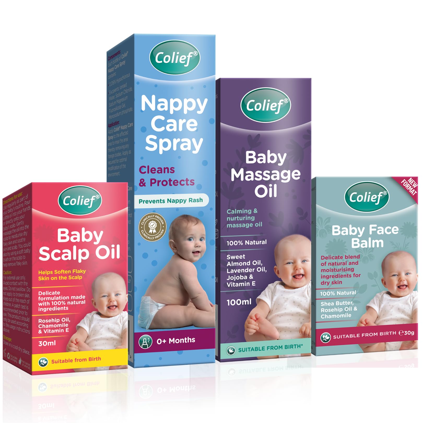 4 Pack Colief Baby Skin Care Essential Set | Newborn Bundle | Natural Nappy Care Spray, Massage Oil, Scalp Oil, Face Balm Stick | All Suitable from Birth