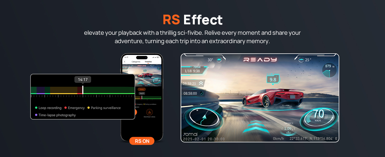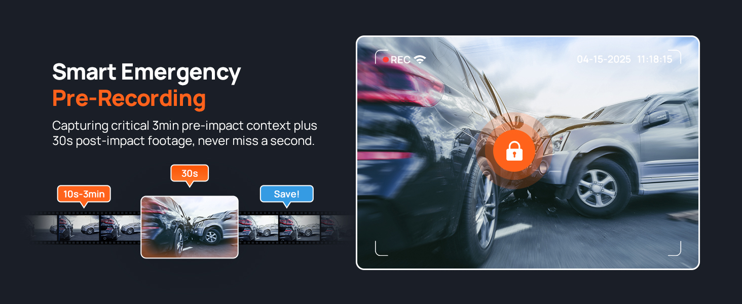 - 【Emergency Recording Extended to 210s】70mai A800SE offers a longer emergency video pre-recording solution. Automatically records 10s–3min before impact + 30s after. With up to 210 seconds of recording time, you can record the full incident timeline. The video recordings before and after the impact will recorded in a special folder.