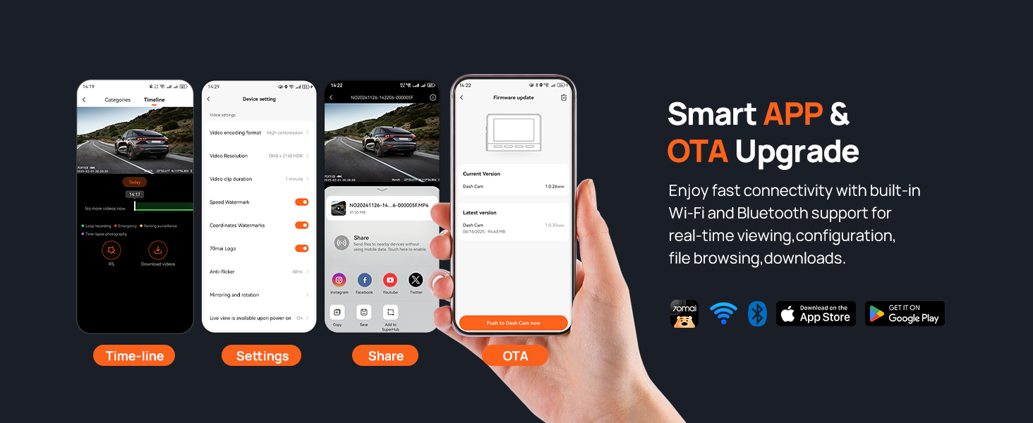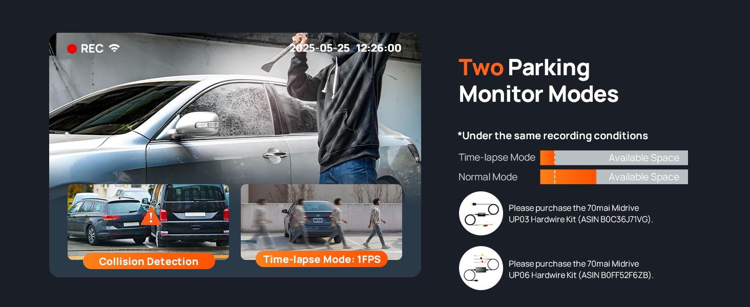 - 【24/7 Parking Surveillance & G-Sensor】With the 70mai UP03 or UP06 Type-C Hardwire Kit, when you leave the car, the G-sensor automatically detects sudden shocks or collisions for you. This dash cam also supports time-lapse, when parked status, the time-lapse mode enables 24/7 recording with 1/30th storage space.【UP03 ASIN: B0C36J71VG, UP06 ASIN: B0FF52F6ZB hard wire kit sold separately】