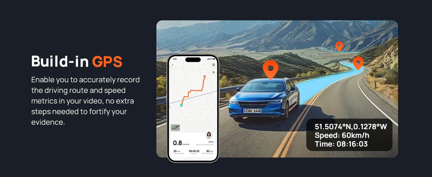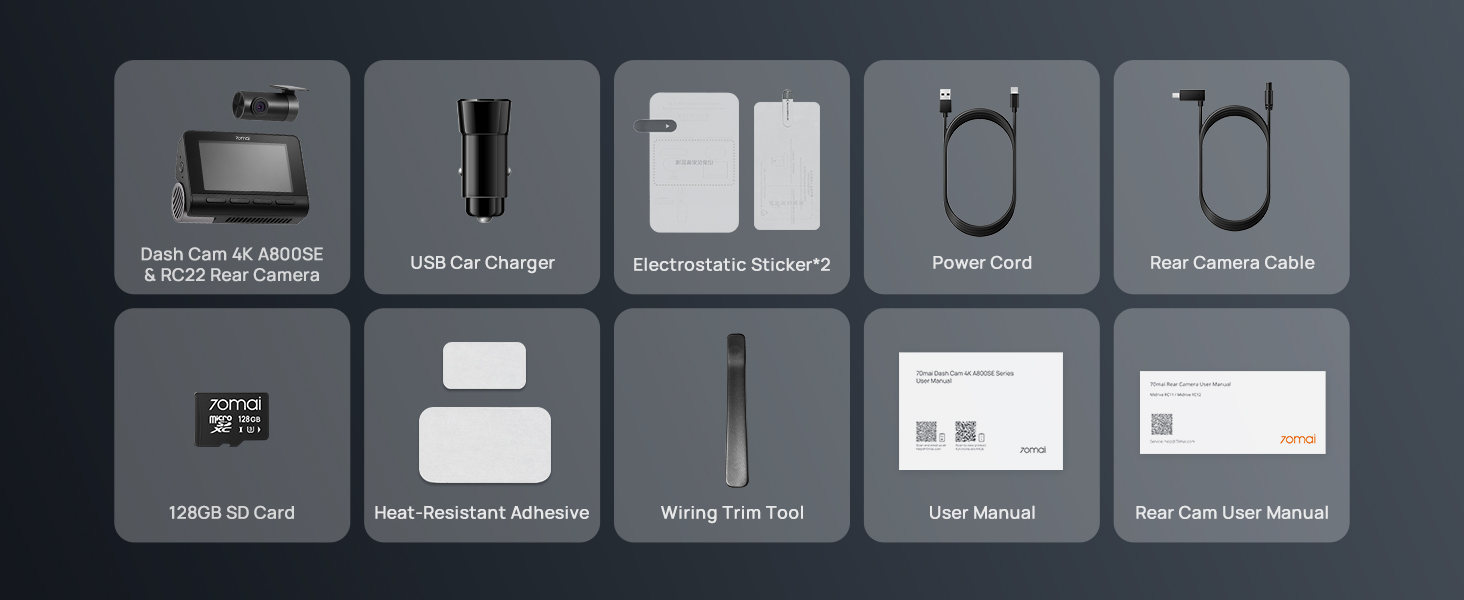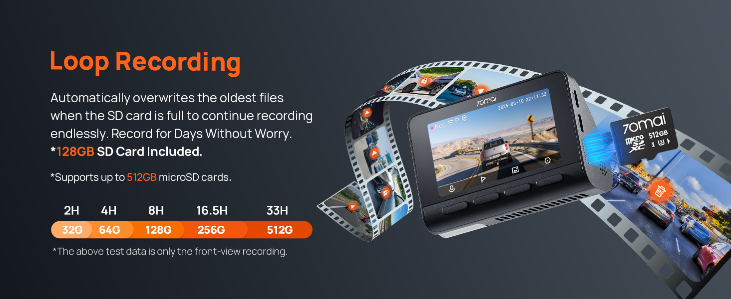 - 【Loop Recording & Massive Storage】With reliable loop recording function, seamlessly overwrites oldest files when storage is full. Ensures uninterrupted continuous recording without the need to delete old videos regularly. The A800SE comes with a 128GB microSD card as standard, saving you the time of picking out an microSD card. It can record about 8 hours when front cam only with 128GB microSD. 【Supports 32GB–512GB microSD cards (U3 or higher)】