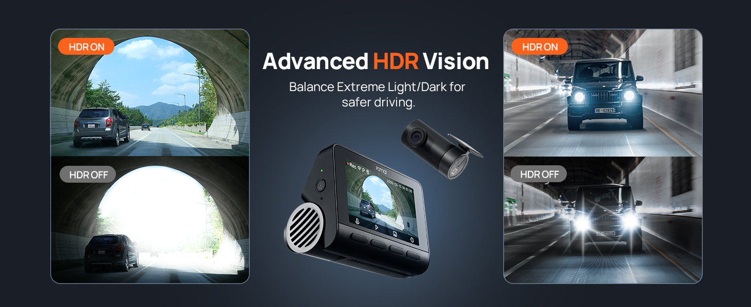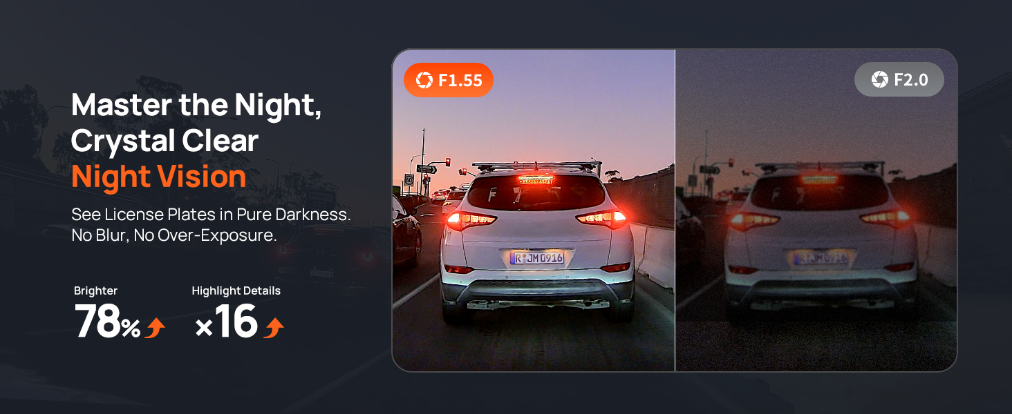 - 【Super Night Vision/F1.55 Aperture Lens】Equipped with an F1.55 aperture and HDR technology, it processes details 16× better than standard dash cams. Focuses more on shooting details in low-light environments, capturing clear images for safer night driving, while balance the light and dark parts of the recording in bright or dark scenes.