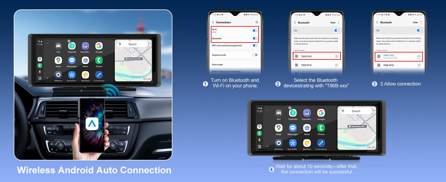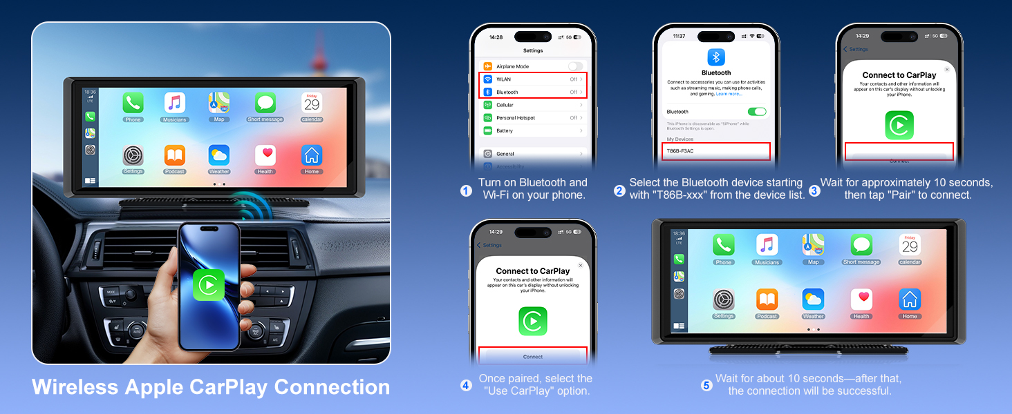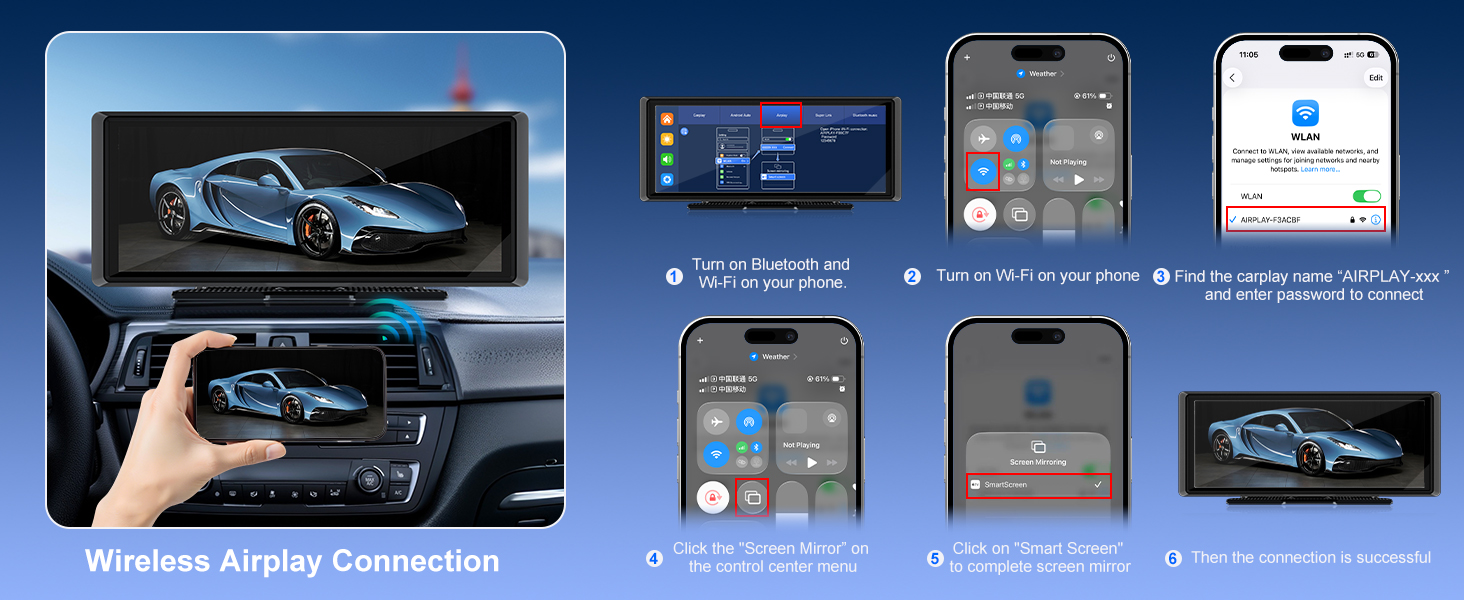 - 【Wireless CarPlay & Android Auto】Enjoy hassle-free wireless connectivity with Apple car play and Android Auto. Simply pair your smartphone to access apps, navigation, calls, and music—no messy cables required.After the initial pairing, the system will automatically connect every time you enter the car—no repeated setup required. Enjoy a smooth, stable connected driving experience from the moment you start your journey.