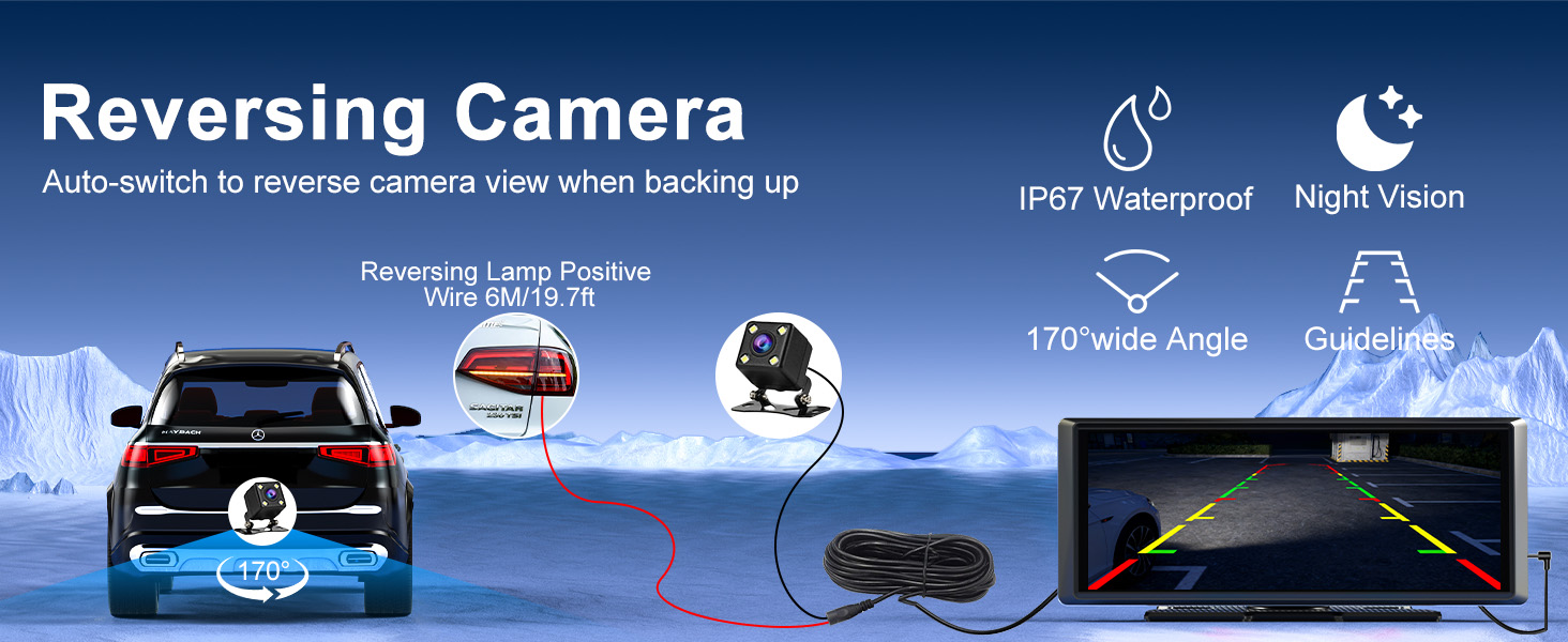 - 【Rear Camera with 19.7ft Cable】Boost safety with a 4-LED rear camera that delivers clear, bright visibility while reversing. For installation, connect the camera’s red wire to the reverse light ,the camera activates automatically the moment you shift into reverse gear. The camera activates automatically the moment you shift into reverse gear. Note: This camera is only for reverse assistance and real-time rear view monitoring; no video recording support.