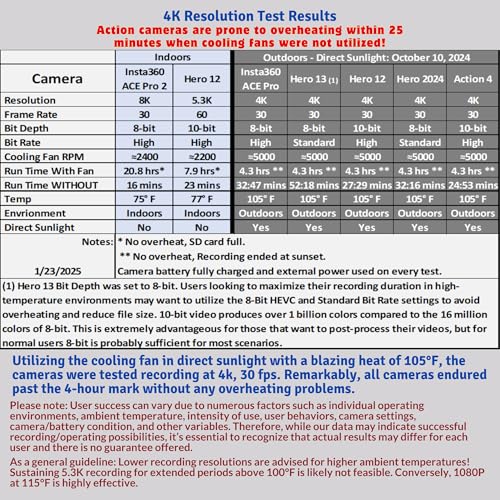 - Action cameras are prone to overheating within 25 minutes without a cooling fan.