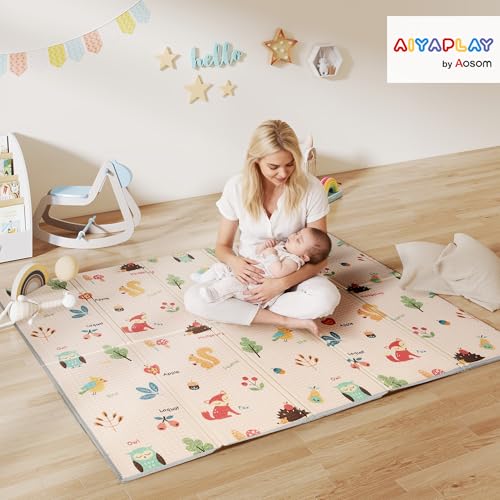 AIYAPLAY Baby Play Mat Double-Sided, Foldable Waterproof Activity Playmat, Reversible Foam Soft Crawling Mat for Bedroom, Nursery and Playroom, 176.5L x 148W cm, Alphabet and Animal Theme