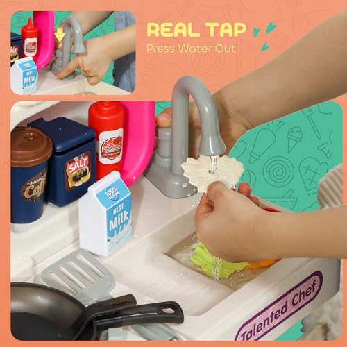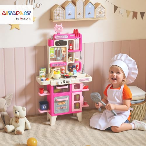 AIYAPLAY Kids Play Kitchen Toy Kitchen Pretend Role Play Set 104PCS Accessories Including Realistic Lights & Sounds, Toy Food, Pots, Utensils, for 3-6 Years, Pink