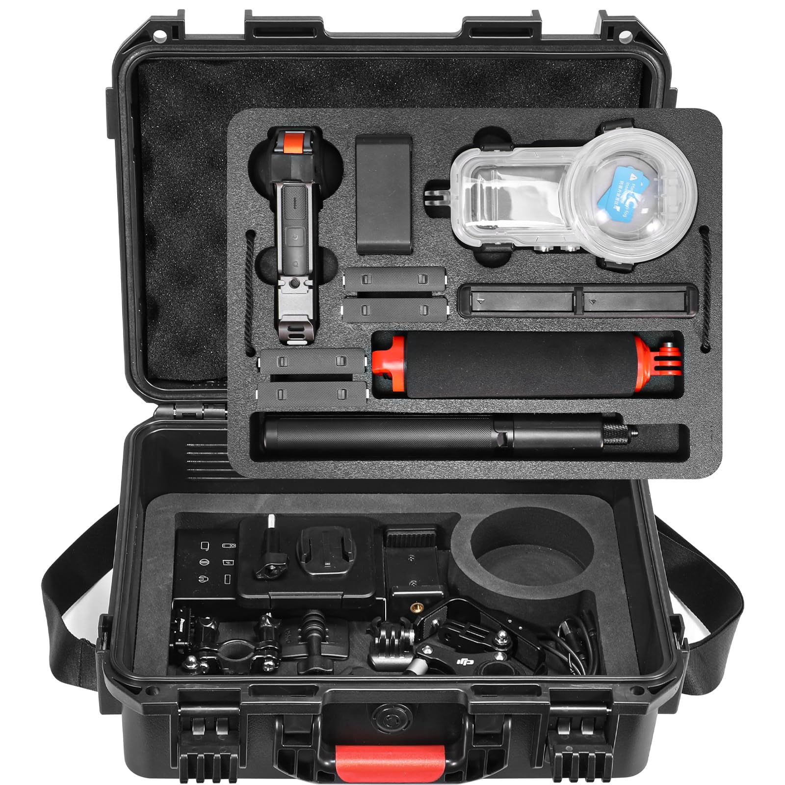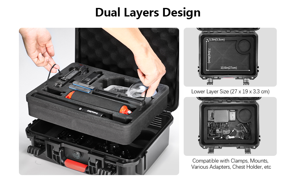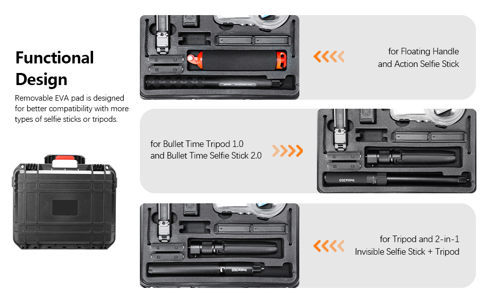 - 【Customized Compartments】The top layer offers a tailored storage system for: Insta 360 camera, X3/X4/X5 Dive Case, Charging hub, 4 batteries, Floating handle, Tripod, Bullet Time Handle 1.0/2.0, Selfie Stick (Compatible with Action or 114cm invisible selfie stick, 2-in-1 tripod selfie stick. NOT for 3M Selfie Stick).