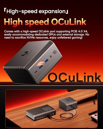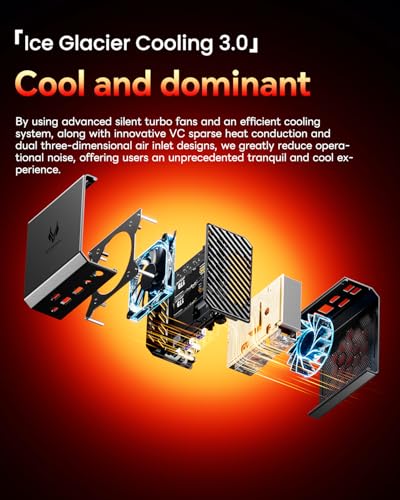 - output of three displays: HDMI 2.1 (4K@144Hz), DisplayPort 2.1 (8K@60Hz) and USB 4 (4K@60Hz), supporting up to 8K resolution. It provides a wide and vivid multi-display environment, allowing users to enjoy 4K video playback, online gaming, browsing and streaming more comfortably.mini PC adopts innovative exhaust outlet and dual fan design, assembling a cooling system that can achieve quick heat dissipation. It supports stable operation of the mini gaming pc and provides a low-noise working environment.