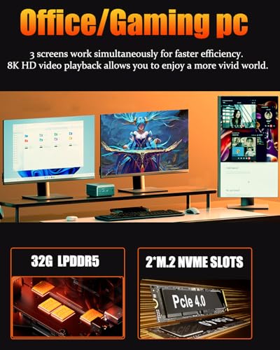 - minipc is equipped with 32GB ultra-fast LPDDR5X 8000MHz memory and 1TB M.2 NVME 2280 (PCIe4.0x4) SSD. Dual SSD slot design, total of 8TB (4TB x 2) for ultra-high capacity storage expansion, no need to worry about running out of capacity. Flexibly meets diverse needs such as video editing, gaming, storing large amounts of data and photos. High data transfer speeds and smooth operability provide a comfortable experience without delay, even when processing multiple tasks simultaneously.